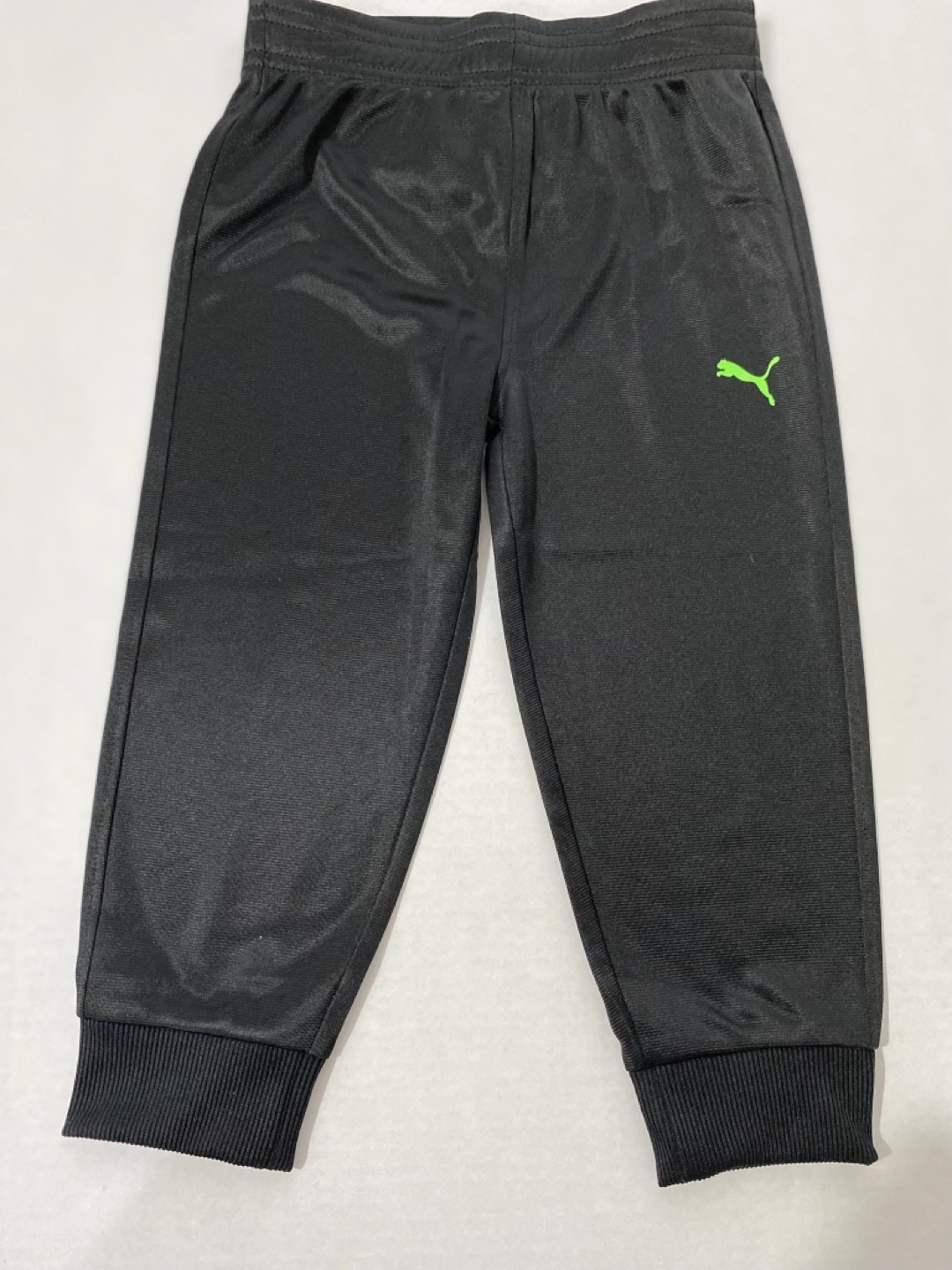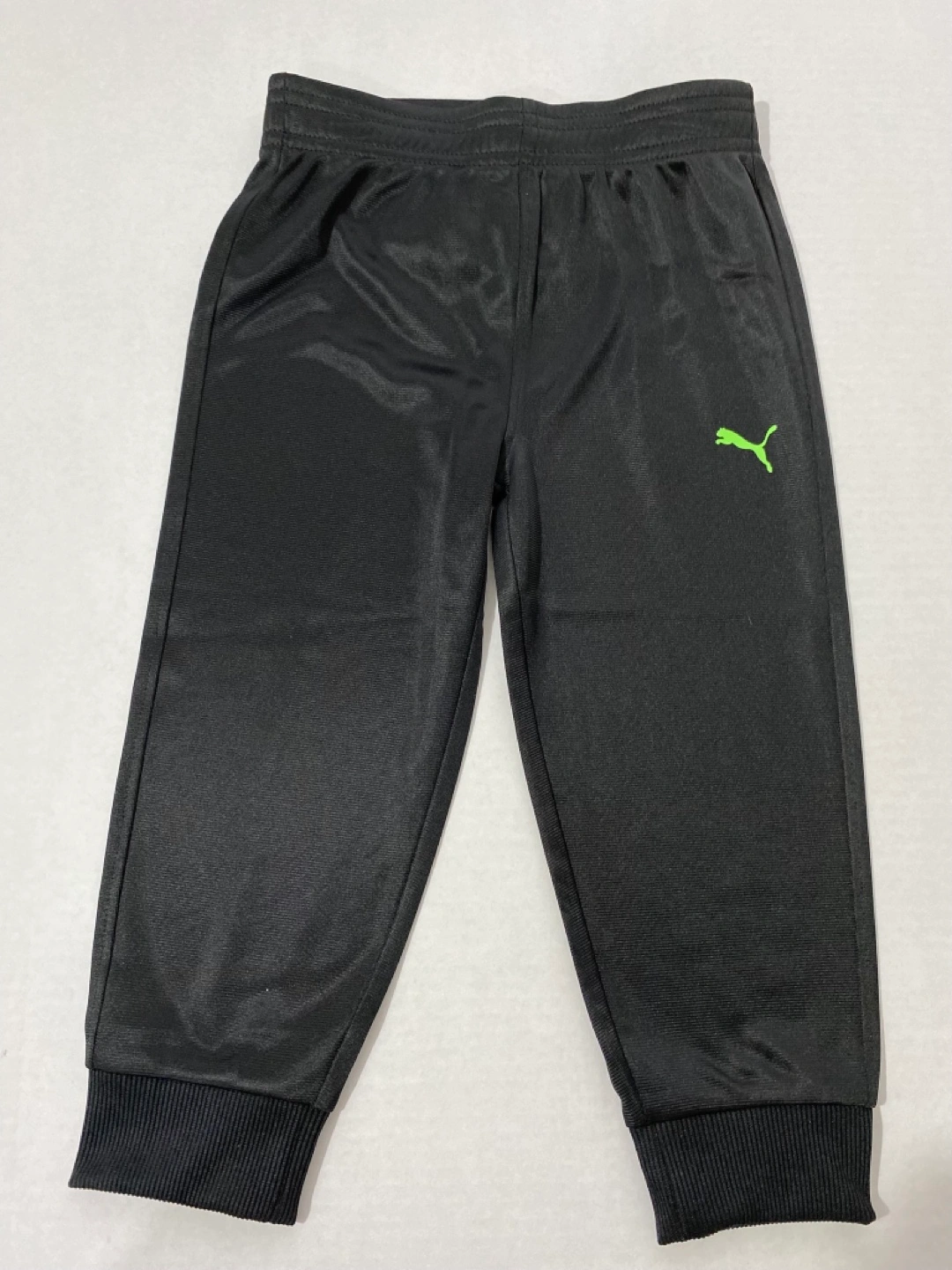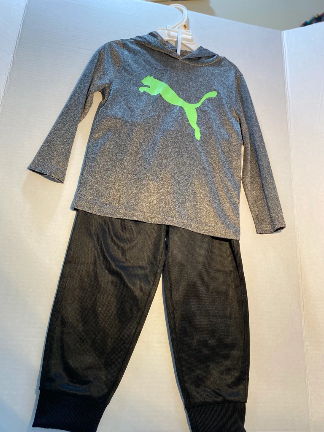 Black jogger pants and a heather gray hoodie. Size 2T. Elastic waistband and cuffs. Lime green Puma logo. Great for playtime or lounging.