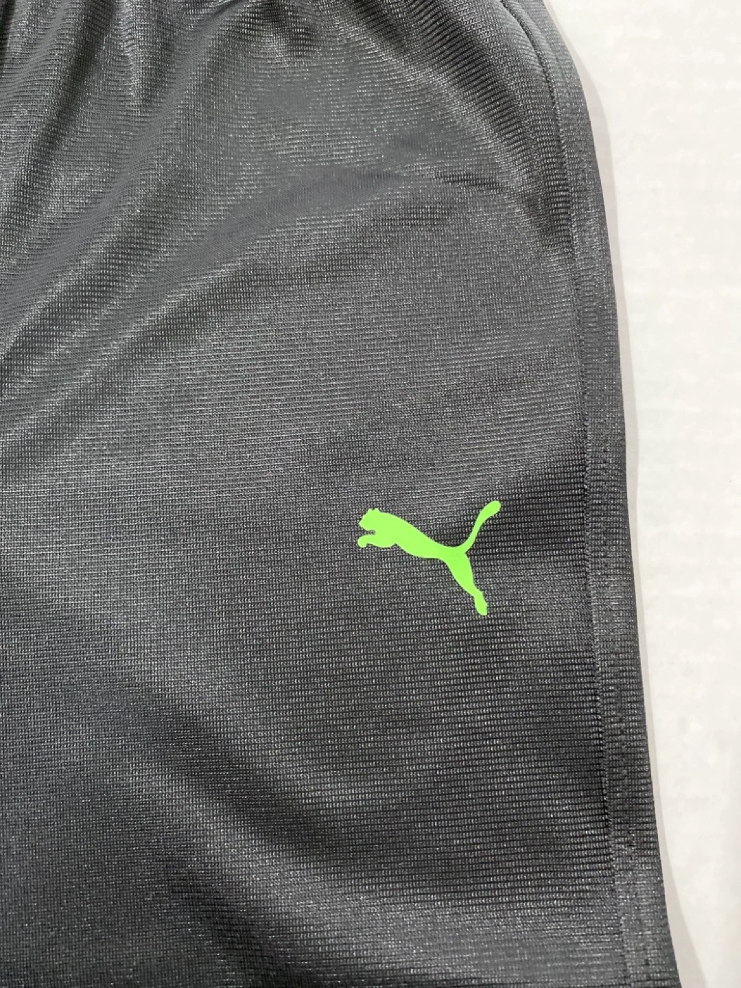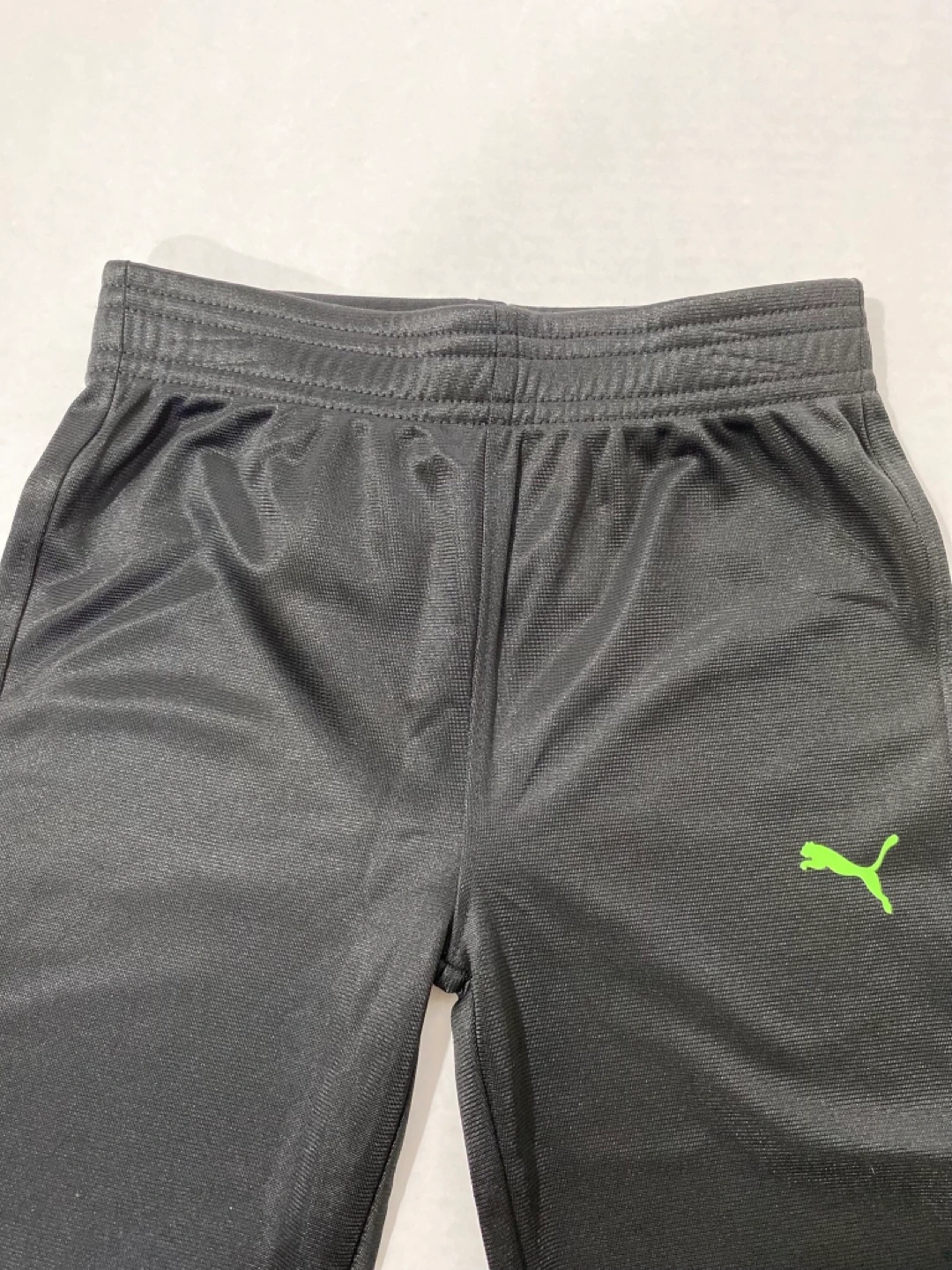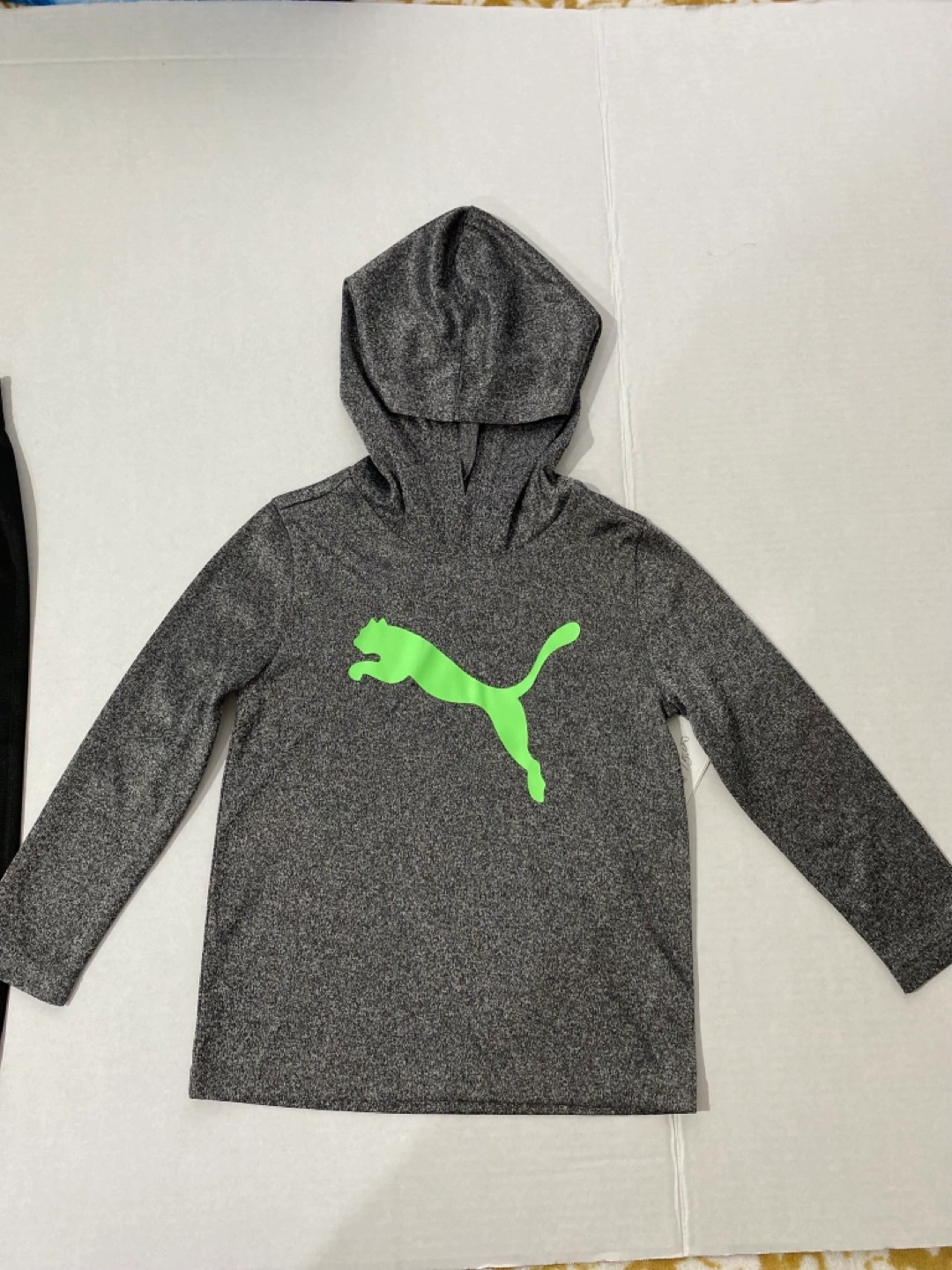 Black jogger pants and a heather gray hoodie. Size 2T. Elastic waistband and cuffs. Lime green Puma logo. Great for playtime or lounging.