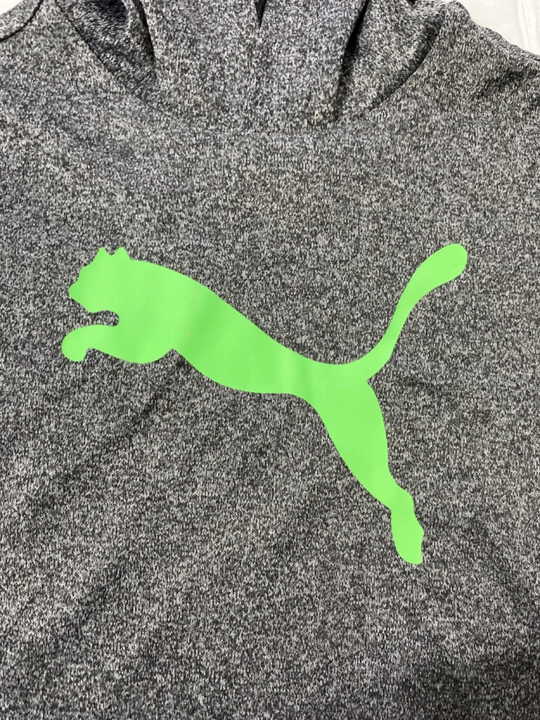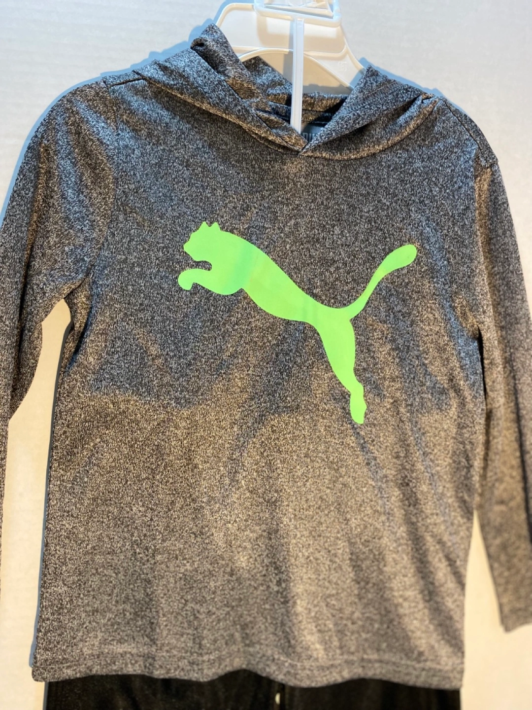 Pantalón jogger negro y sudadera con capucha gris jaspeado. Talla 2T. Cinturilla y puños elásticos. Logotipo de Puma verde lima. Ideal para jugar o descansar.