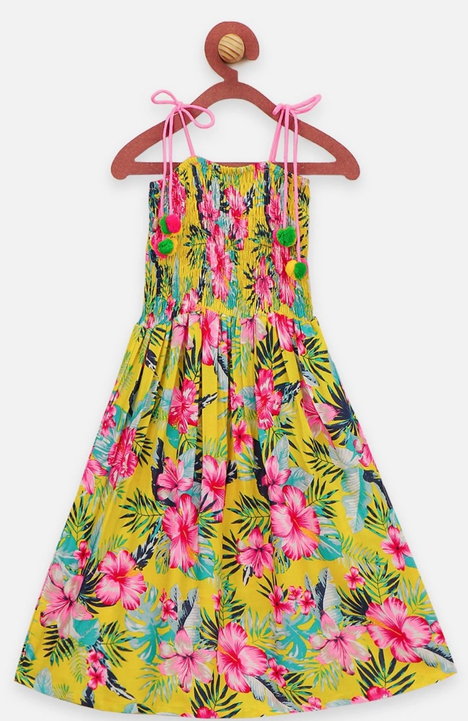 Adorable girls' sundress. Features a vibrant yellow floral print, smocked bodice, and playful pom-pom shoulder straps. Flowy midi length. Perfect for summer.