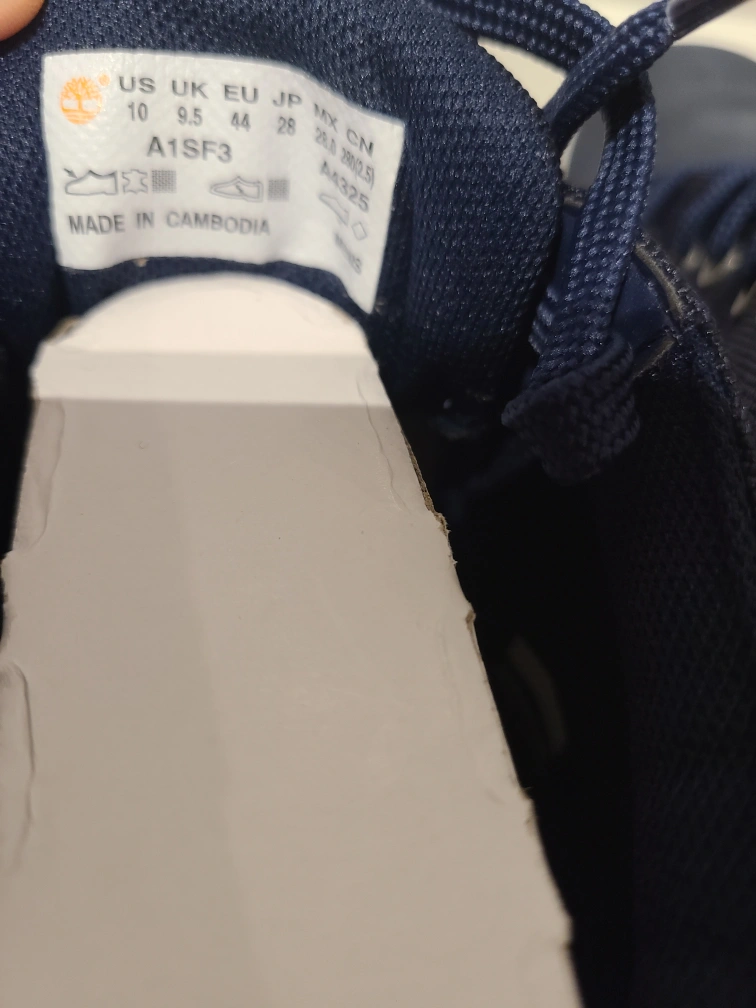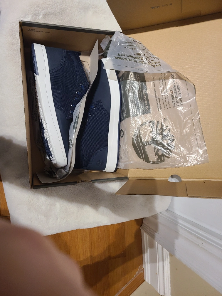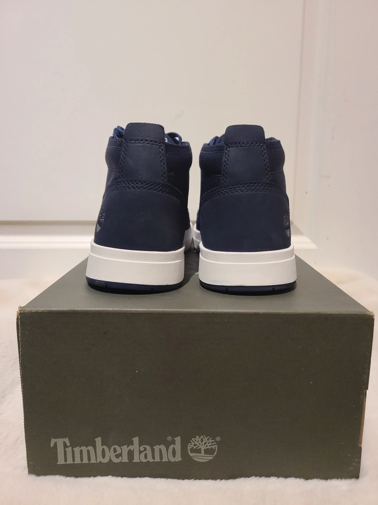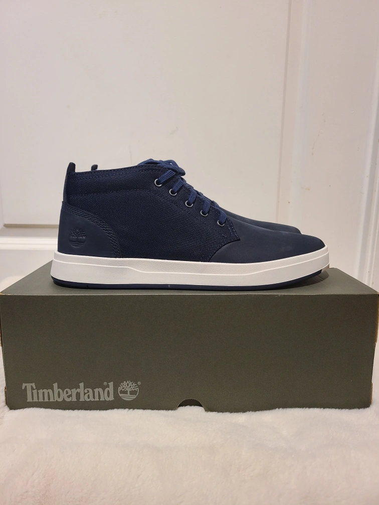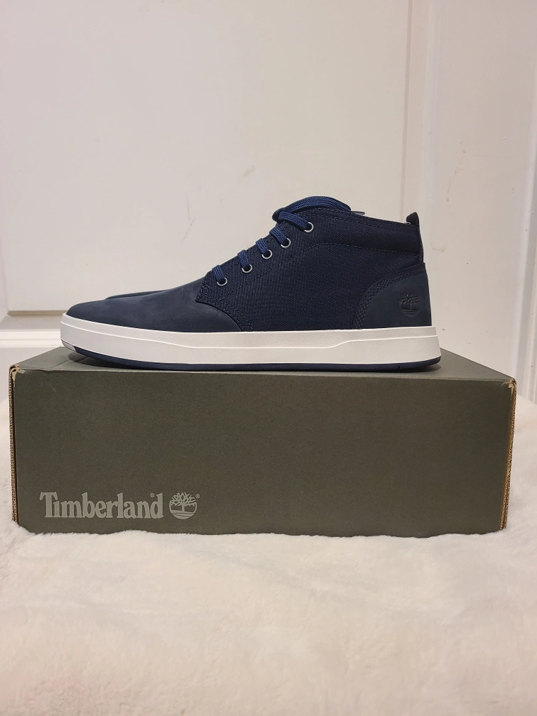 Men's size 10 Timberland Davis Square Chukka boots. Navy blue leather and fabric upper. White sole. New in box.