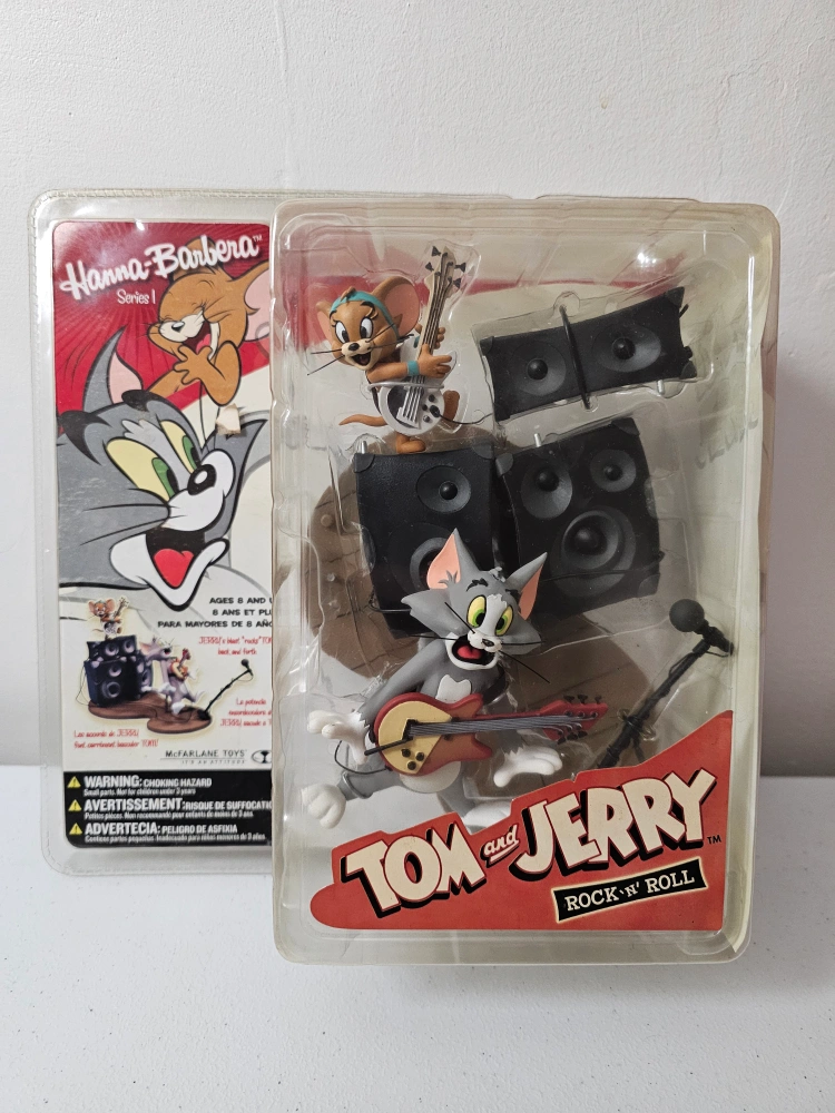 New in box. Collectible Tom and Jerry figures. Rock and roll theme. Includes Tom, Jerry, guitars, and speakers. Hanna-Barbera.