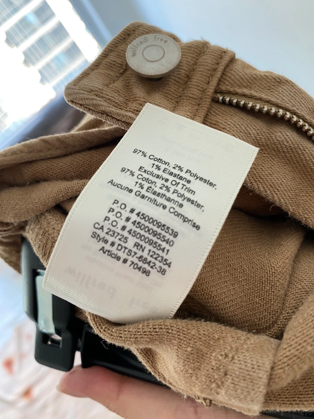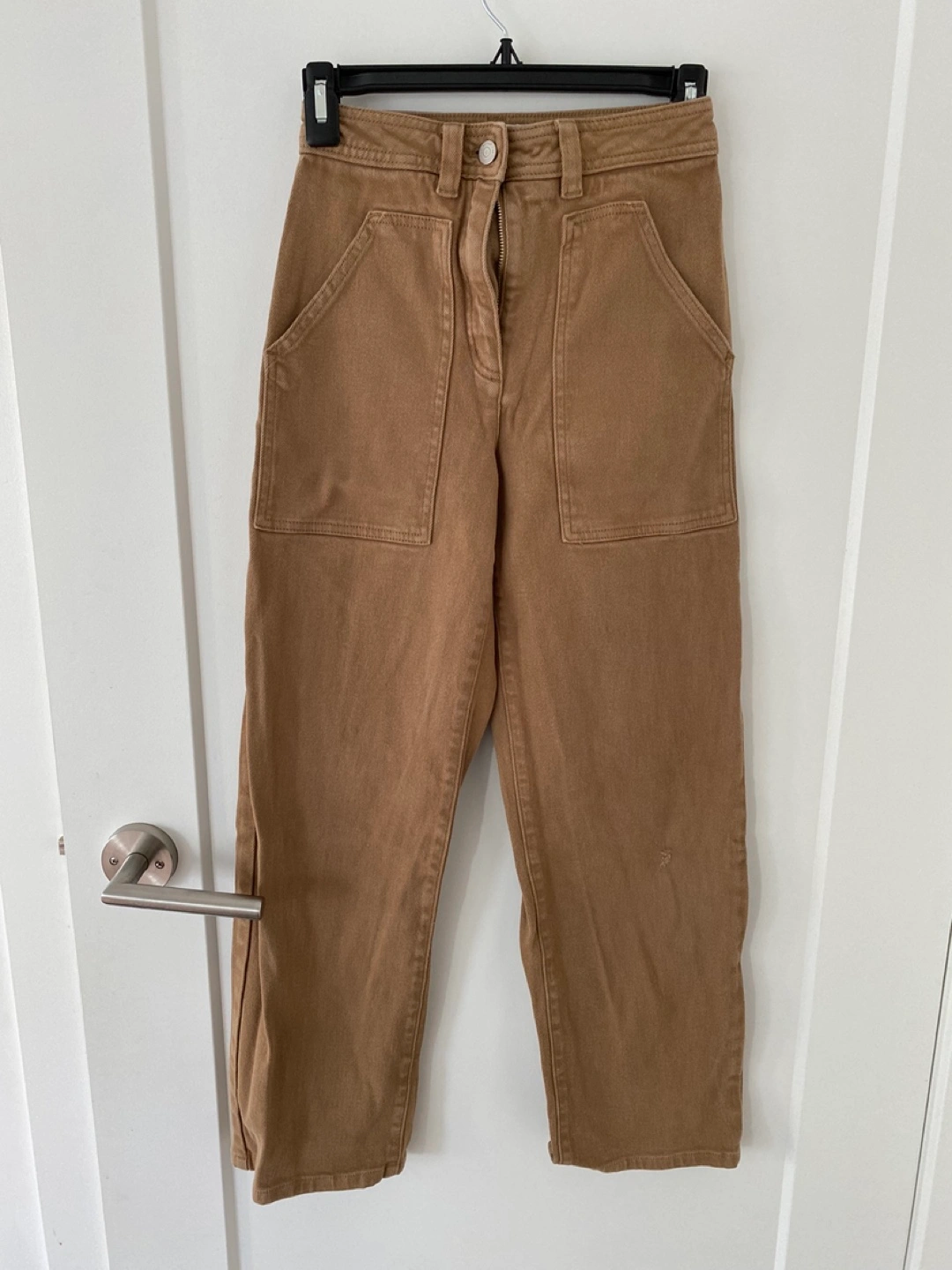 High-waisted brown pants. Size small. Features front and back pockets. Zip fly and button closure. Made in China.