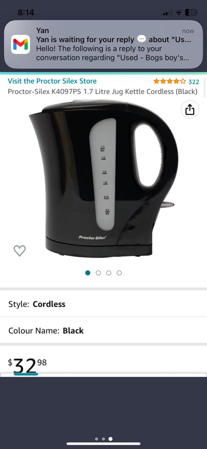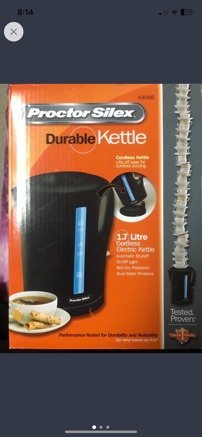 Black cordless kettle. 1.7 litre capacity. Features dual water windows and boil-dry protection. Durable and reliable.