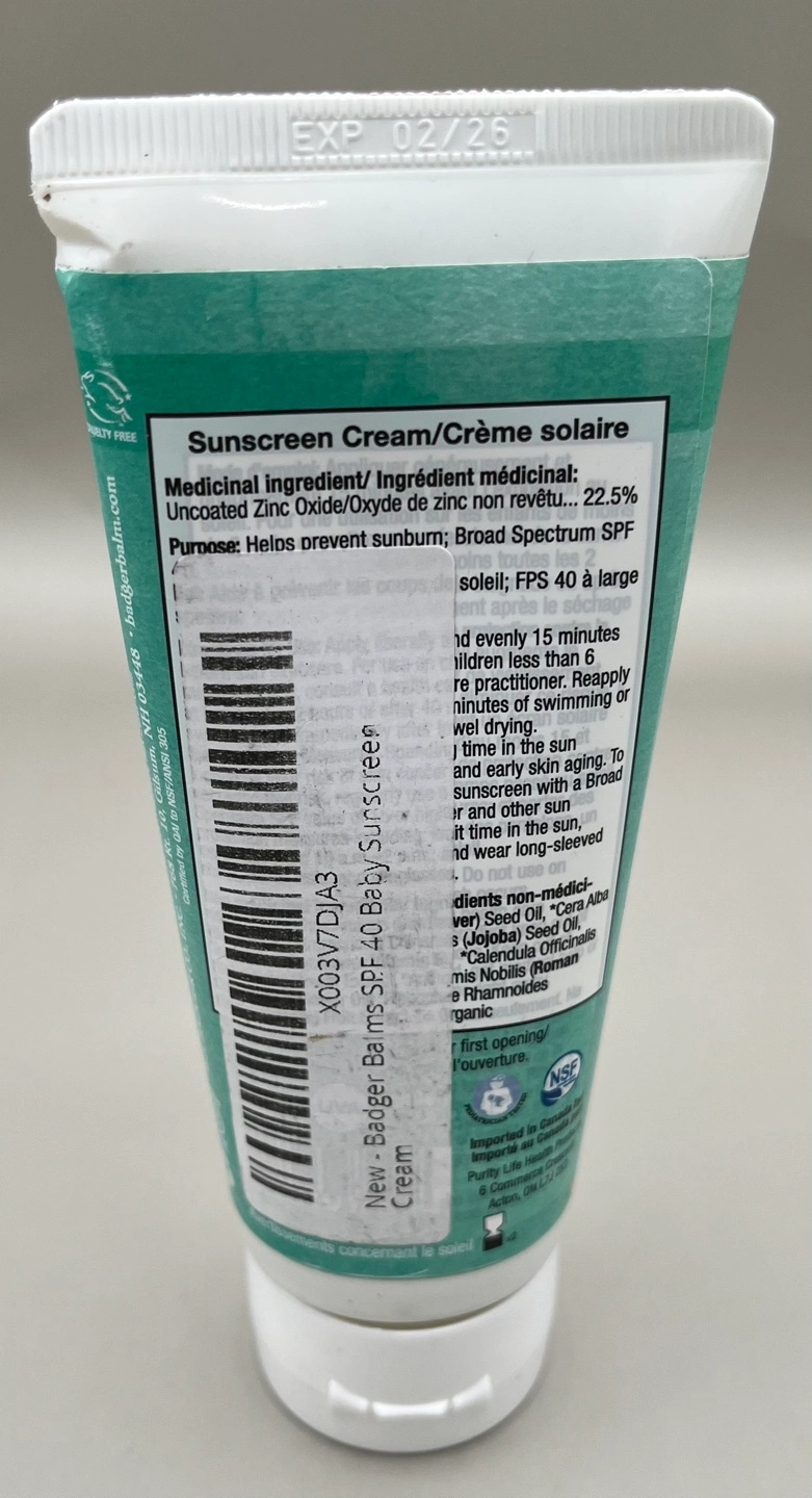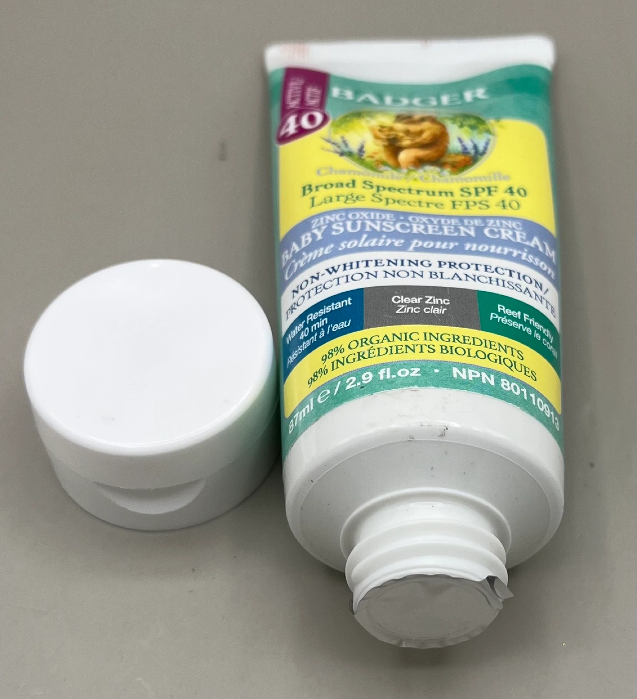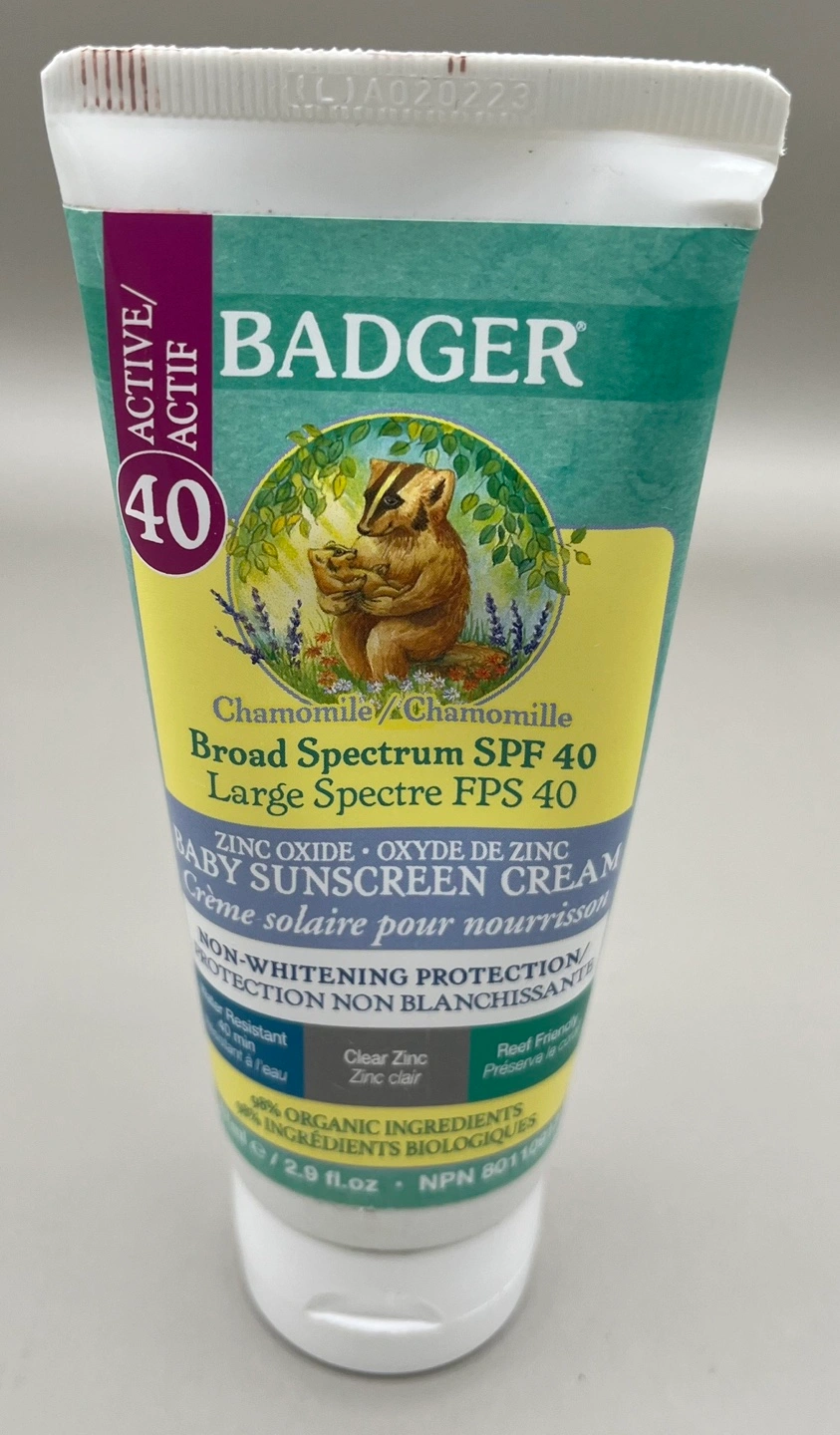 Badger Baby Sunscreen Cream, SPF 40, Chamomile. Broad spectrum protection. Zinc oxide. 80ml/2.9 fl oz tube. Water resistant, 40 minutes. Organic ingredients. Non-whitening, clear zinc.