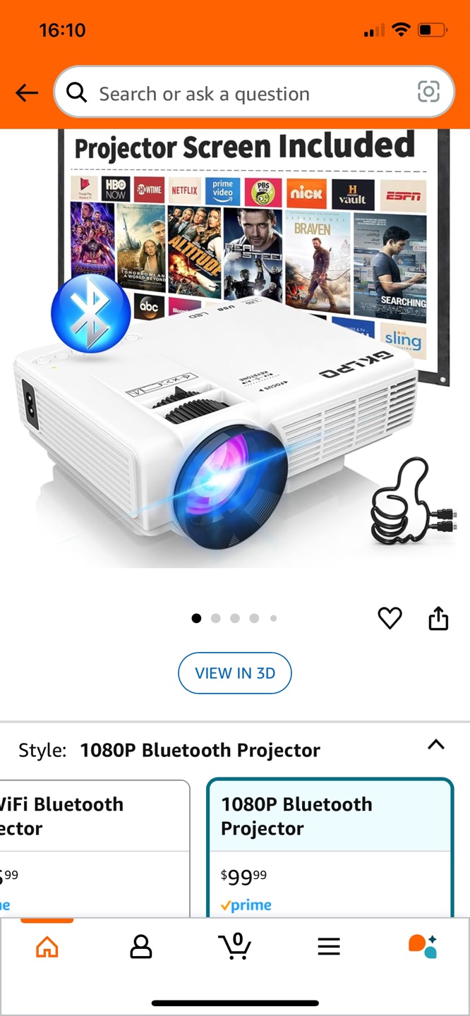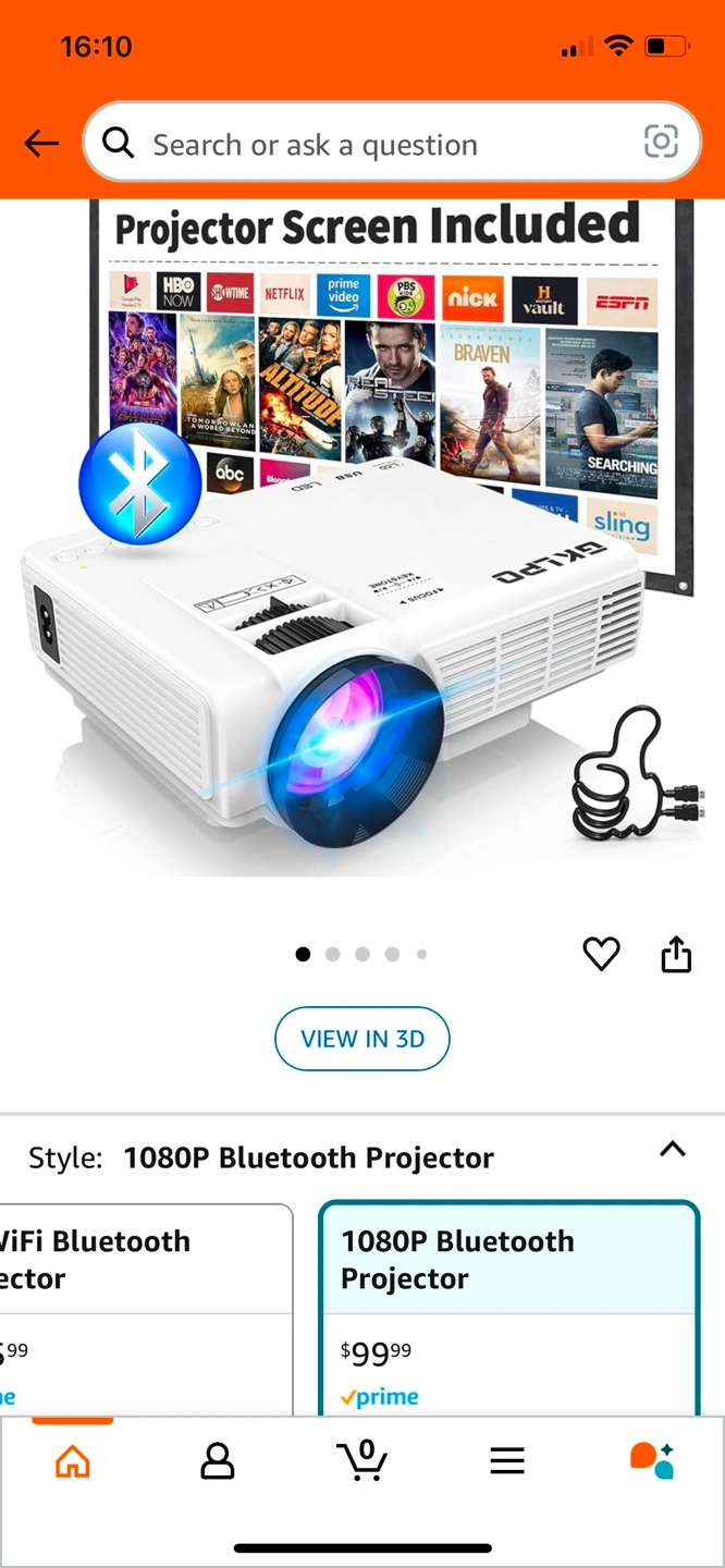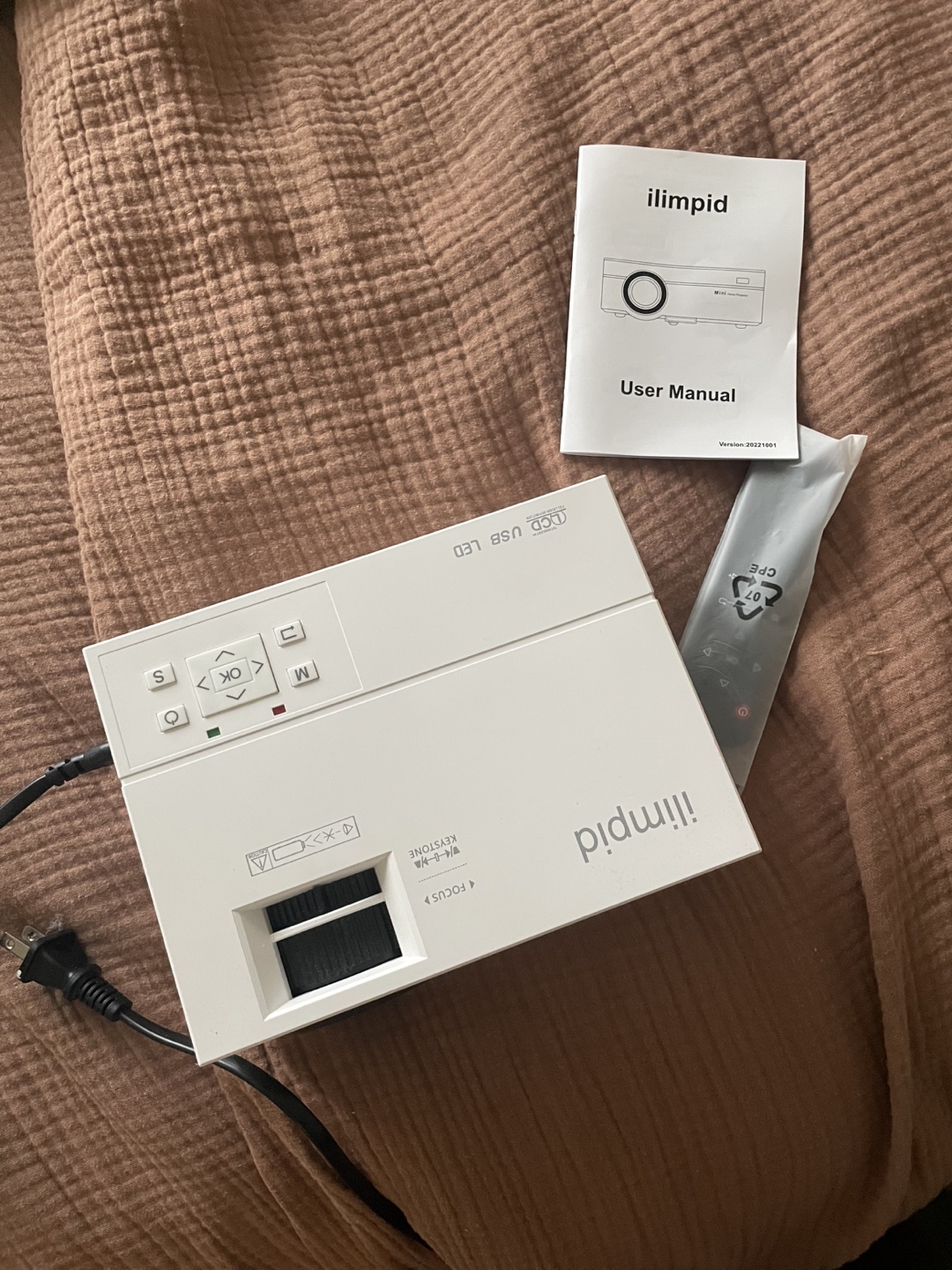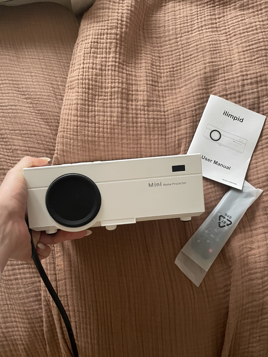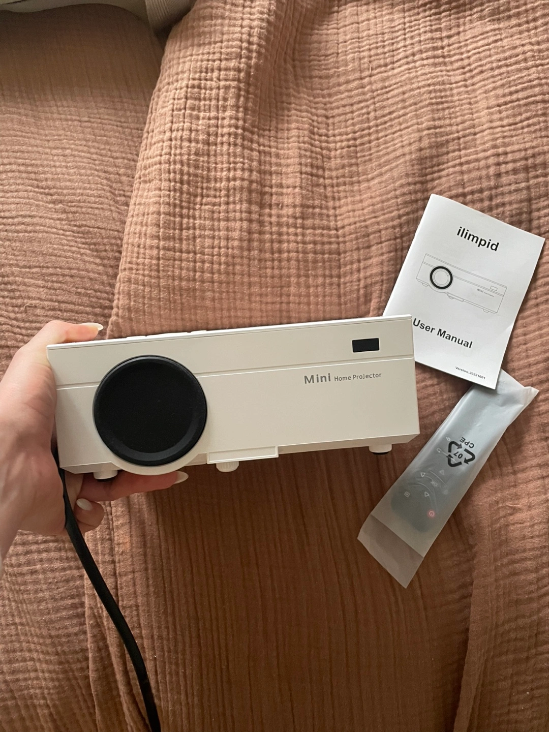 Portable mini projector. Includes remote and user manual. Bluetooth and WiFi capabilities. 1080P resolution.