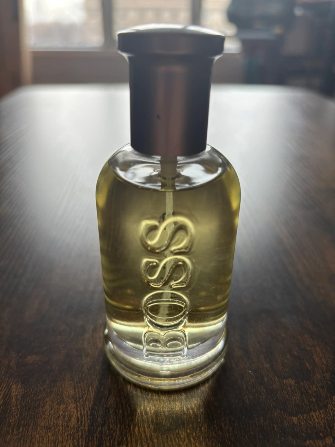 “Natural spray. Men's fragrance. Woody, fruity, masculine scent. Apple, cinnamon, and sensual woods notes.”