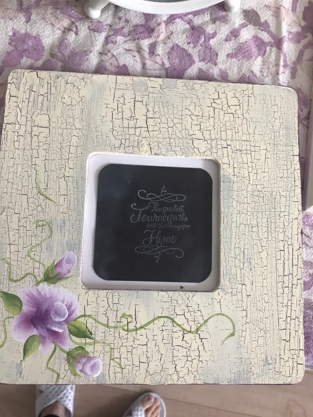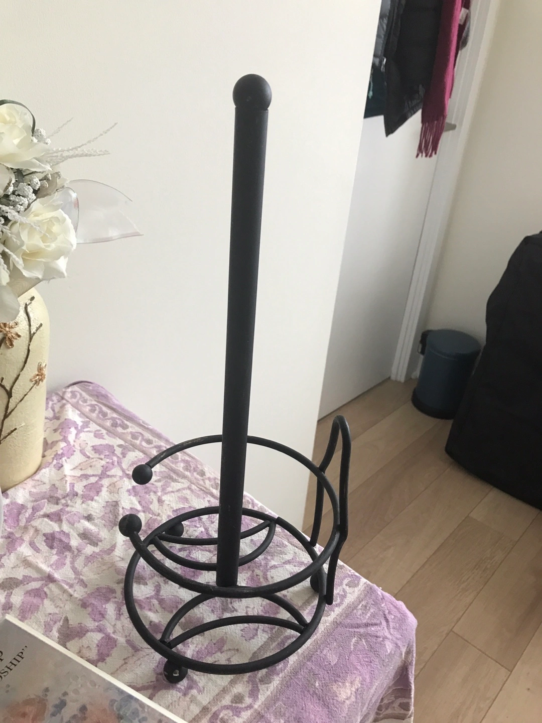 Charming vintage-style photo frame, distressed finish, floral accents. Black metal freestanding paper towel holder, simple design. Both items pre-owned.