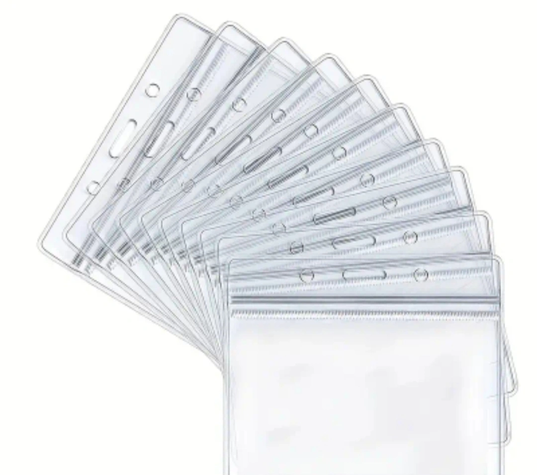 Ten (10) clear plastic badge holders. Three hole pre-punched. Approximately 3.78 inches by 3.43 inches. Includes a slot for inserting cards or passes. Great for organizing employee IDs or event passes.