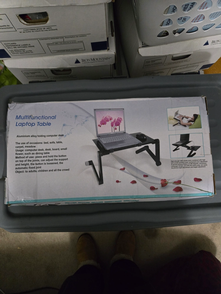 Aluminum alloy folding computer desk. Use on bed, sofa, table, or floor. Adjust height and support with button. Suitable for adults and children.