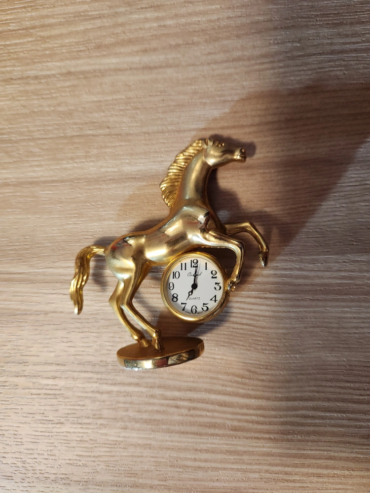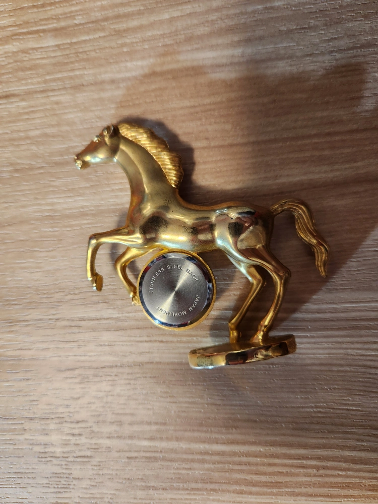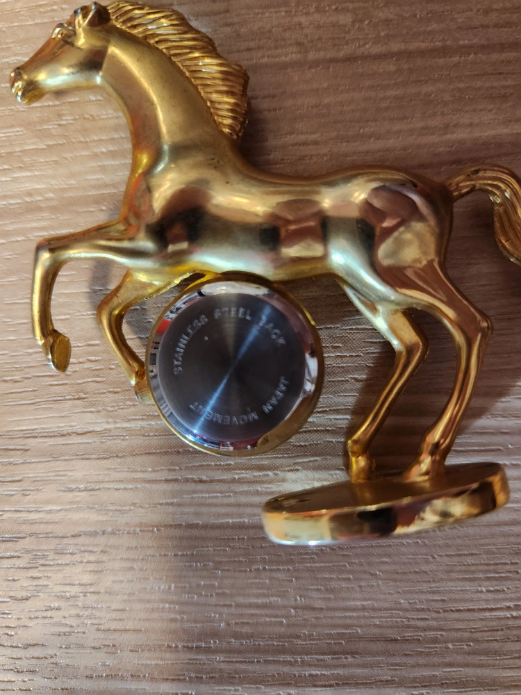 Gold-colored horse shaped clock. Quartz movement. Small size. Perfect for a desk or mantle. Made in Japan. Needs a new battery.