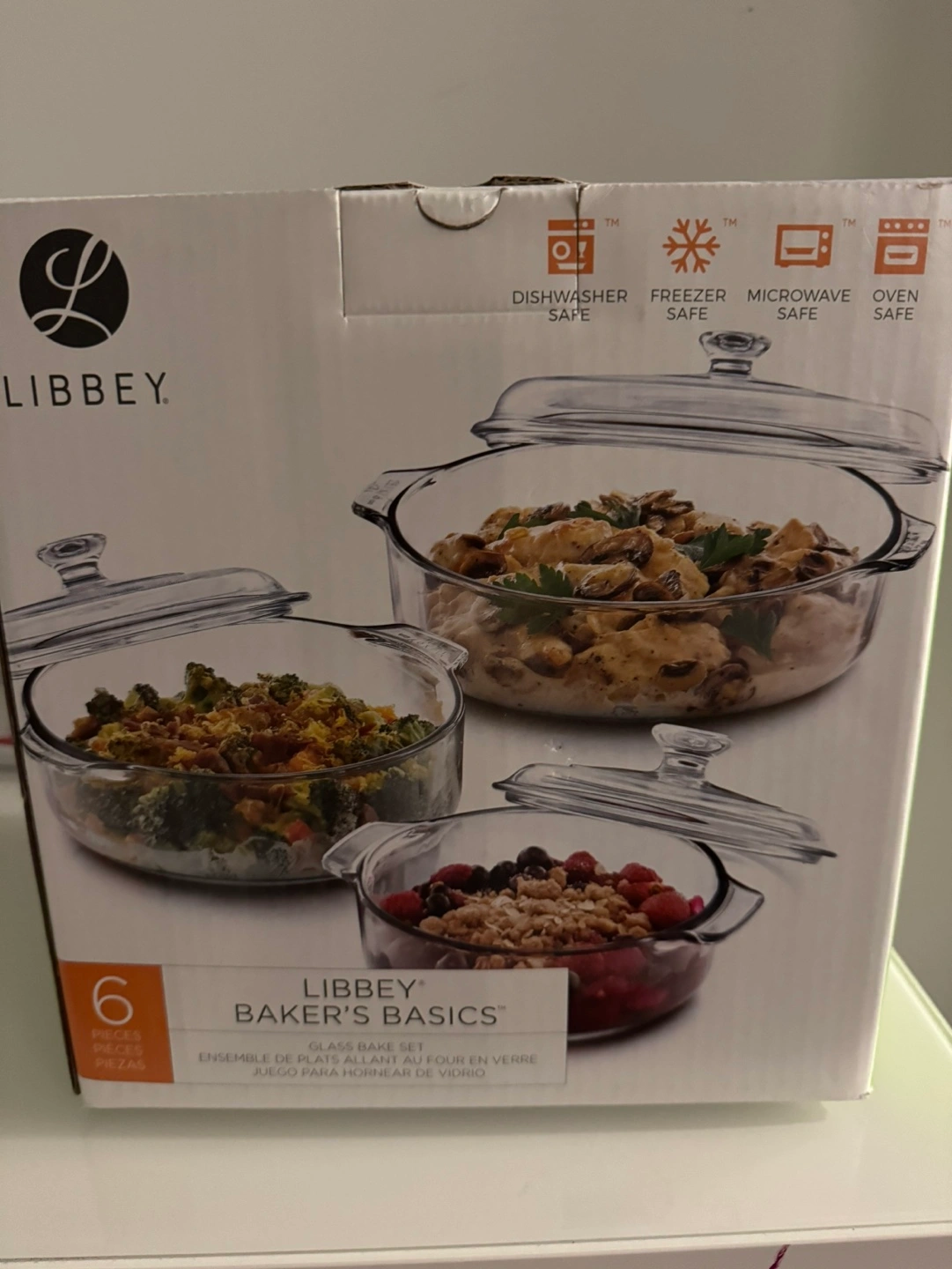 New in box. Six-piece glass bake set. Includes three different sized dishes. Oven, microwave, freezer and dishwasher safe.