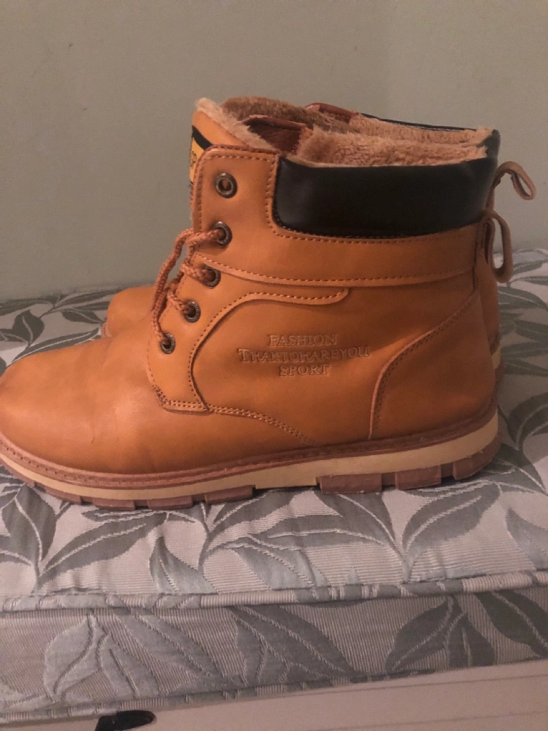 Warm, faux fur lined winter boots. Lace-up closure. Tan leather-like material. Durable sole. Good condition. Mccowan and 16th porch pickup Cash only