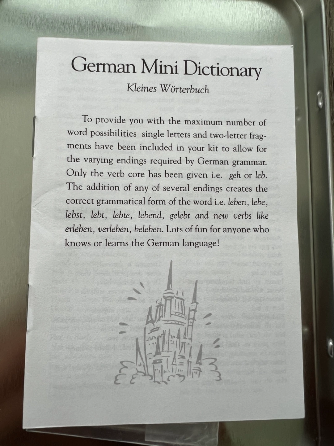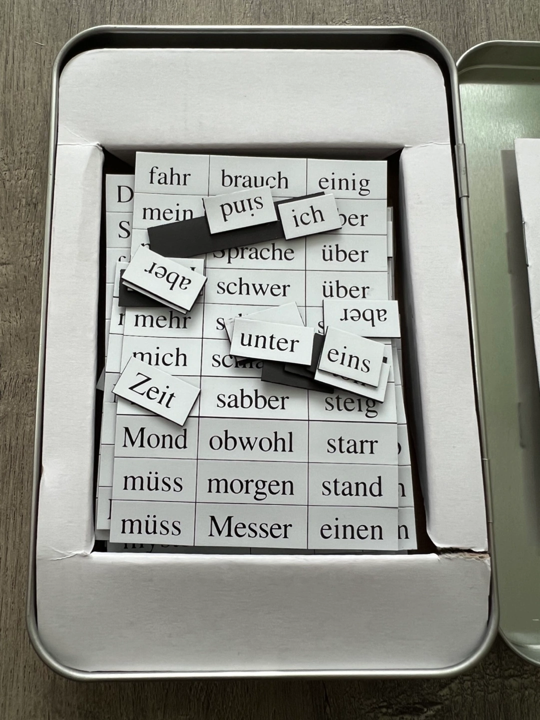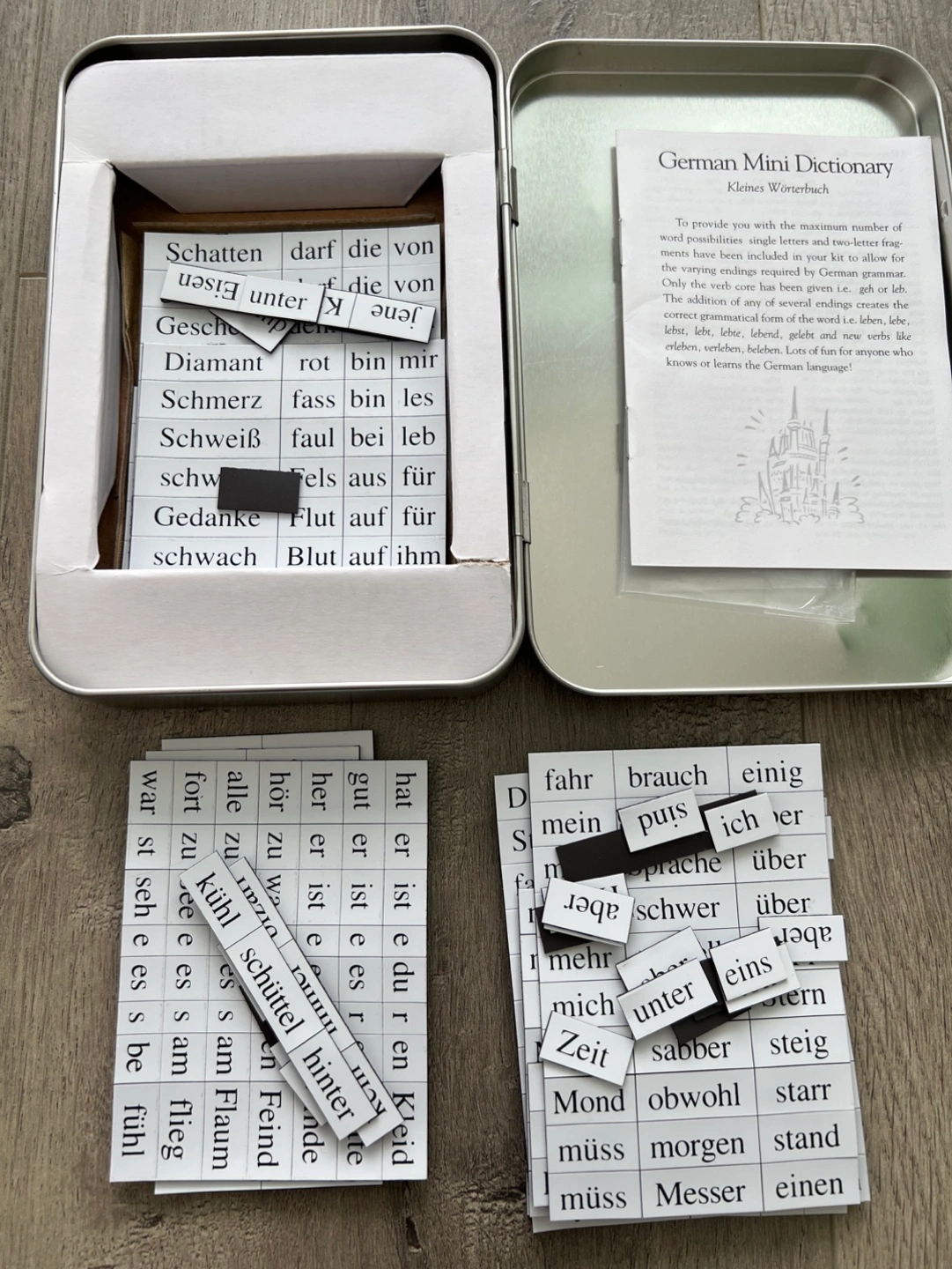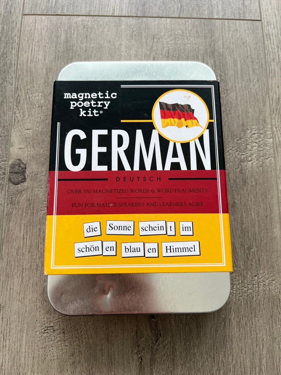 Magnetic poetry kit. Over 550 magnetized German words and word fragments. Fun for native speakers and learners. Includes mini dictionary. Tin storage case.