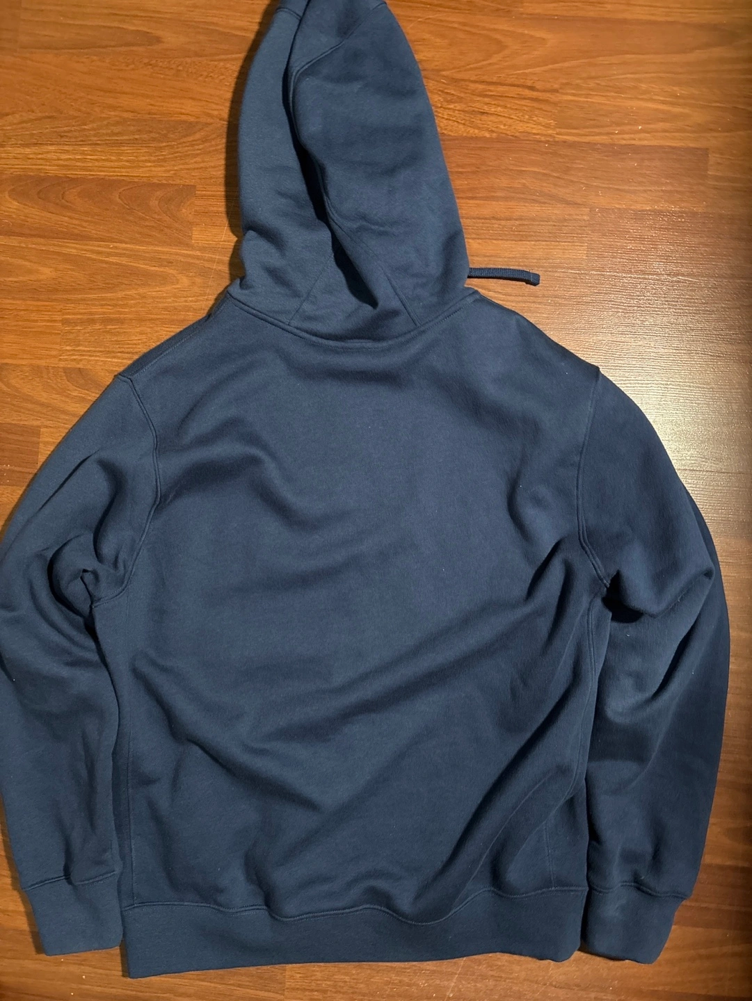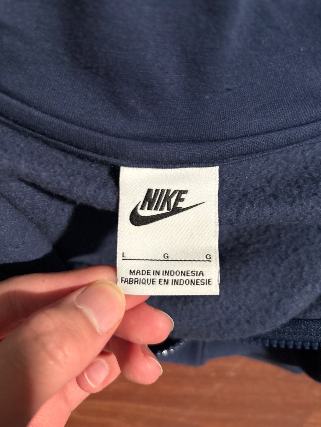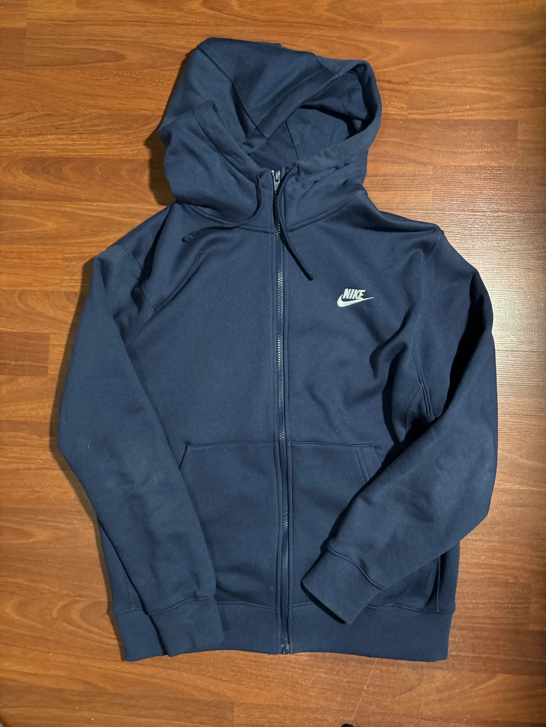 Men's navy blue Nike zip-up hoodie. Size large. Features a kangaroo pocket and a small Nike logo on the chest. “IN GREAT CONDITION!!!”. Feel to msg me for the price or questions. I am happy to communicate!