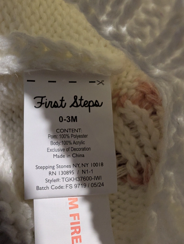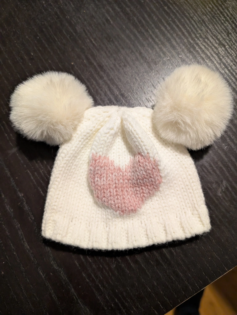 Adorable baby hat. Features ivory knit body, pink heart design, and fluffy pom-poms. Size 0-3 months.
