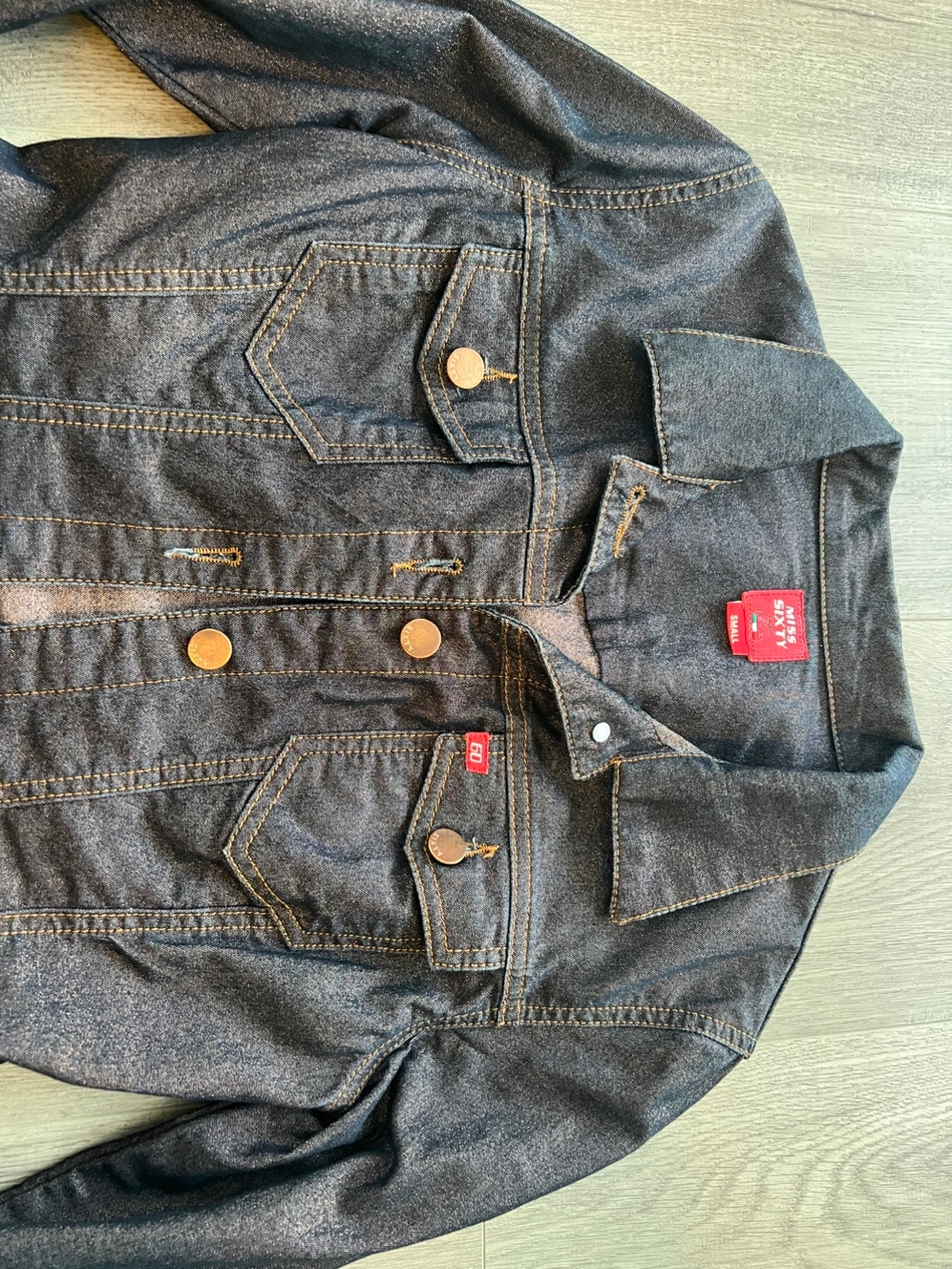 Dark wash glitter denim jacket and matching pants. Gold coloured buttons. Small size. Long sleeves. Straight flare leg pants.
