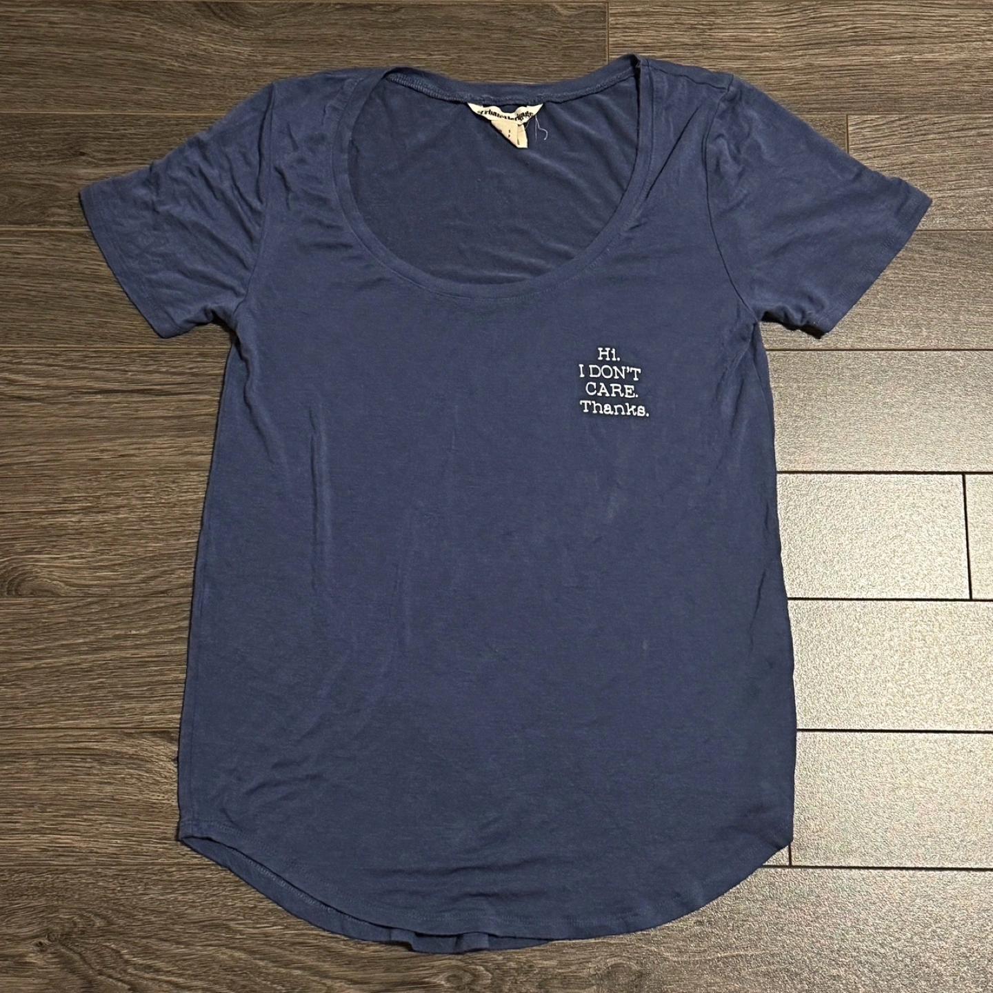 61Blue scoop neck t-shirt. Short sleeves. Curved hem. Small embroidered text on front that says “Hi I don’t care thanks” CASH ONLY PICK UP ONLY