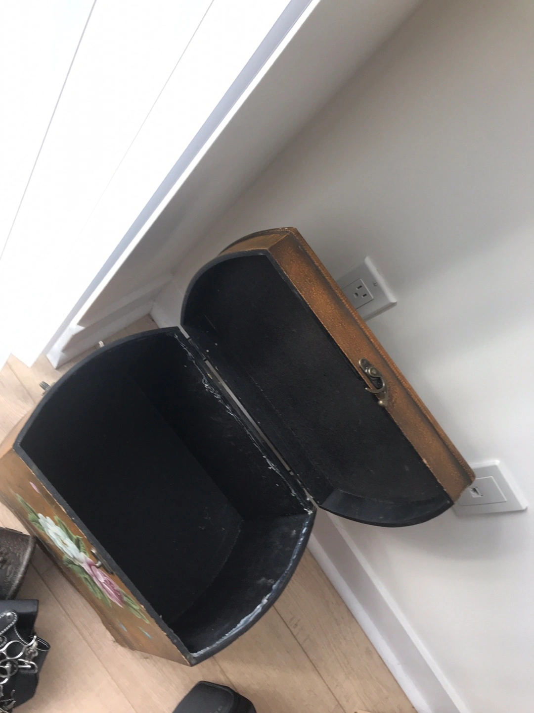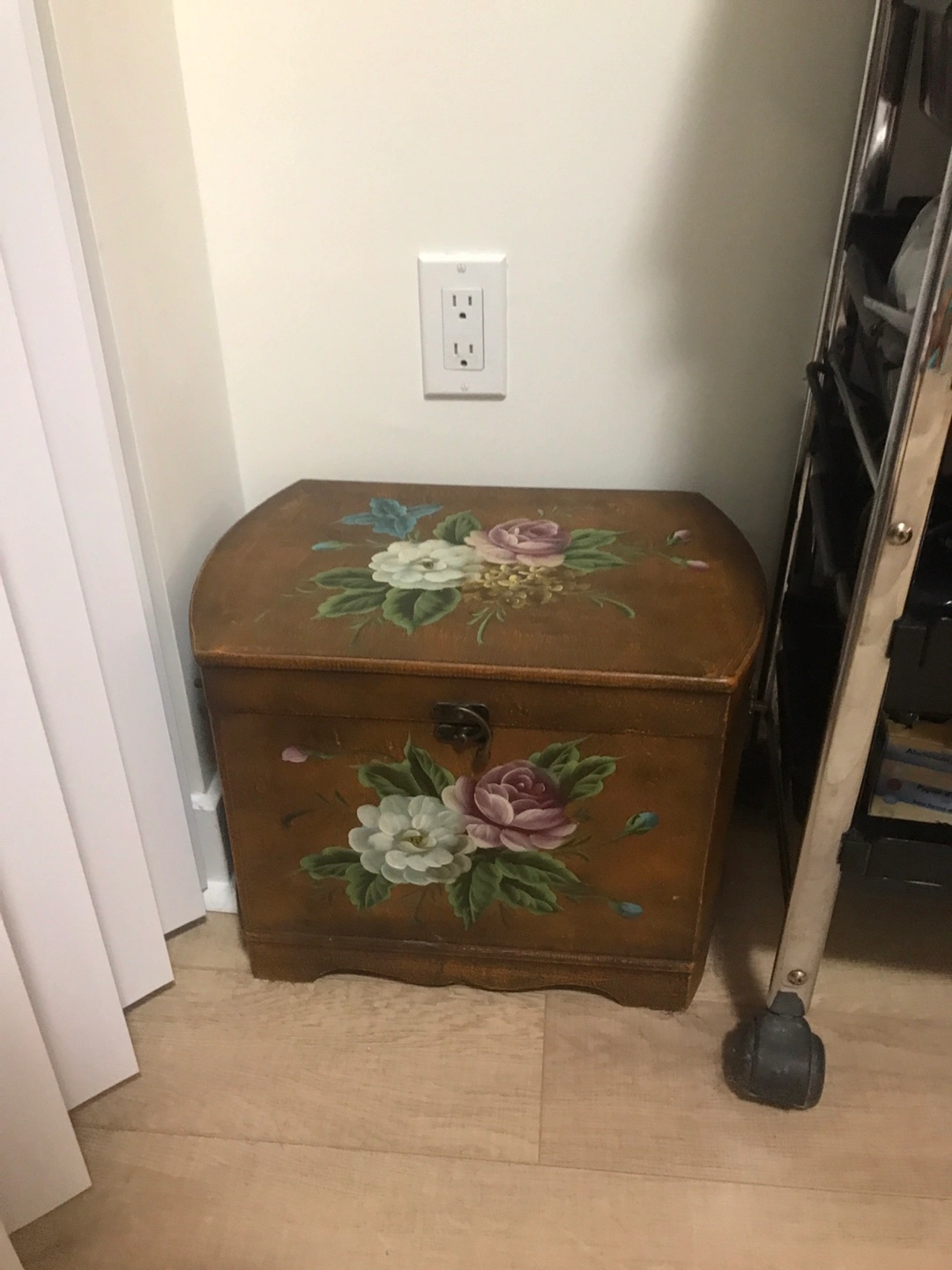 Beautiful hand-painted wooden chest. Features floral design. Small and compact. Ideal for storage or display. Has a hinged lid and latch.