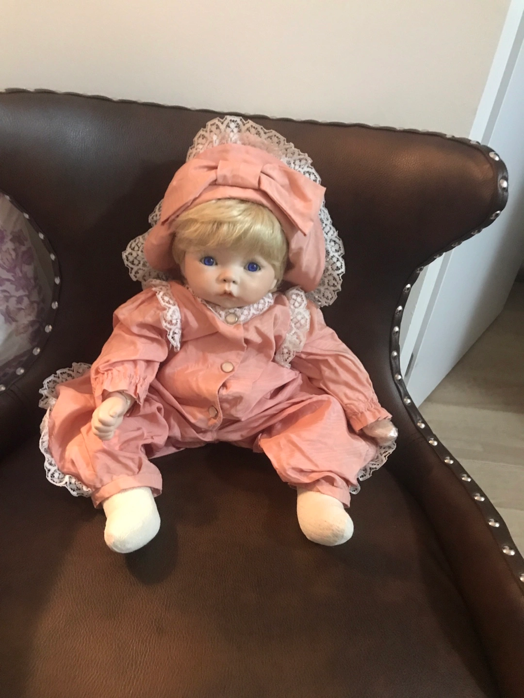 Precious porcelain baby doll. Wearing a pink outfit with lace accents. Blonde hair and blue eyes. Collectible doll, perfect for a nursery or doll collector. Heavy weight like Ms really baby.