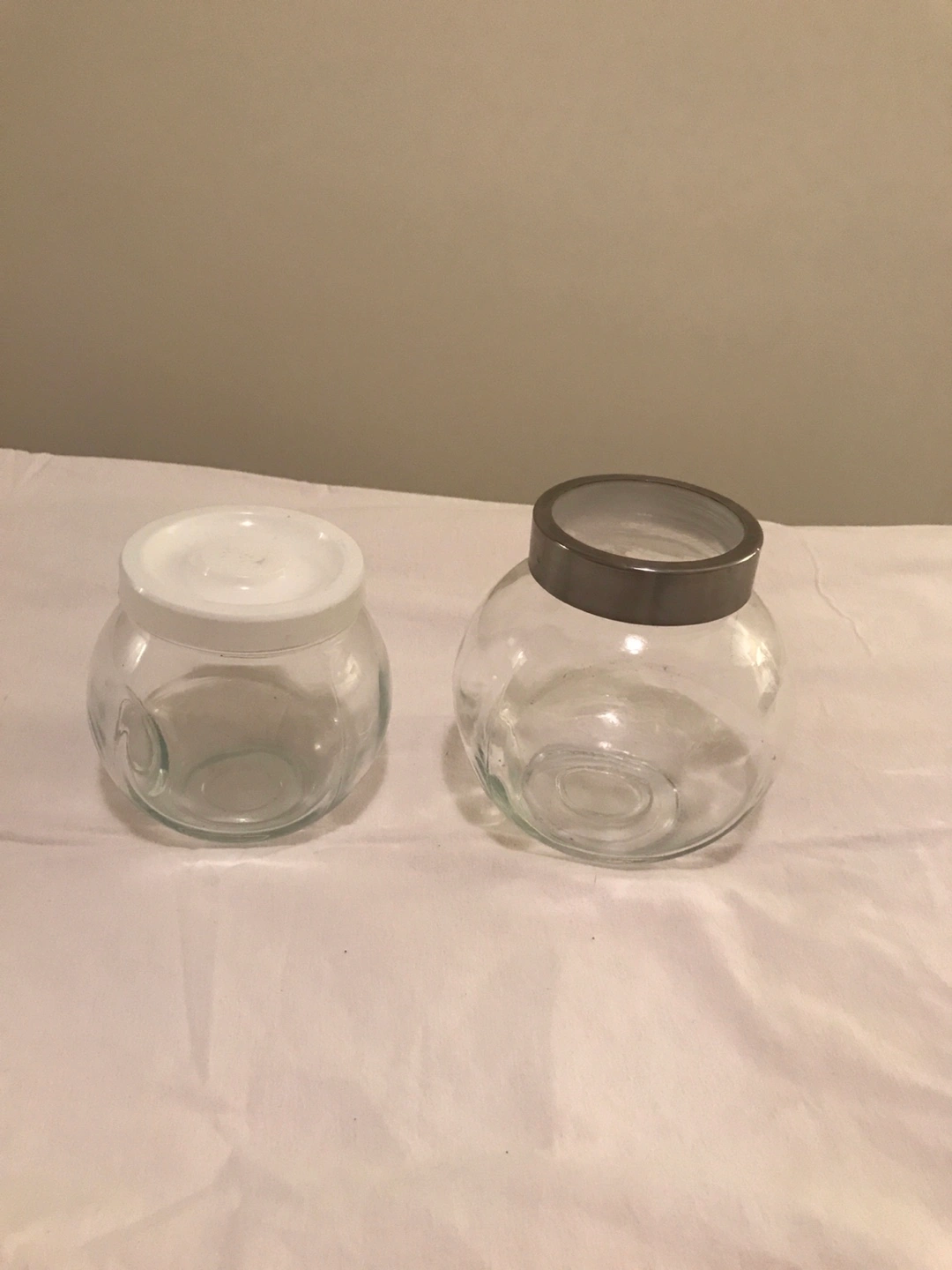 Set of two clear glass canisters. One has a white lid, the other a silver-toned lid. Perfect for storing treats or organizing your pantry.