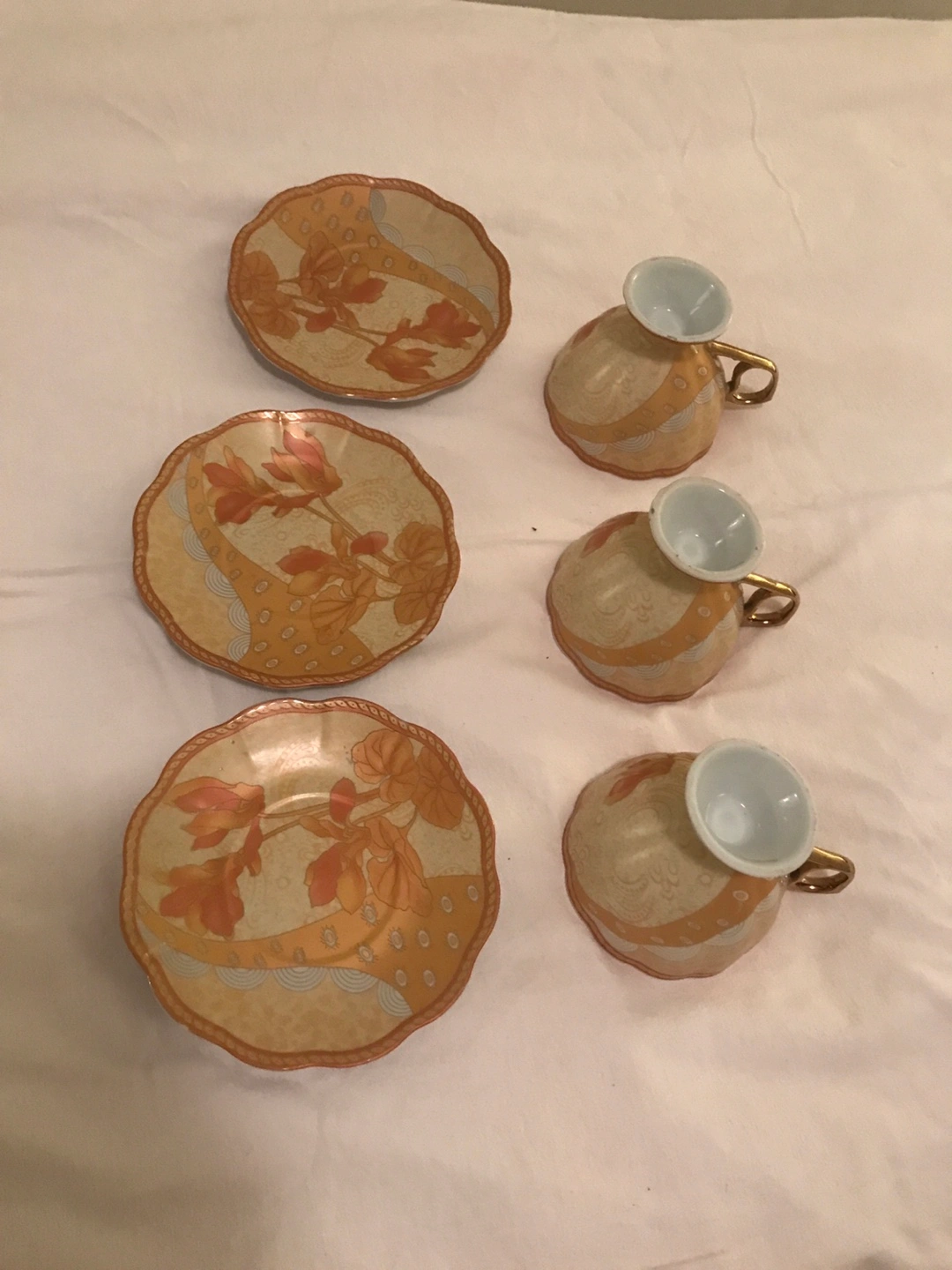 Elegant teacup and saucer set. Features a beige and orange floral pattern. Gold accents on the edges. Perfect for afternoon tea or a special occasion.