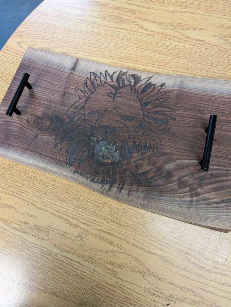 Unique live edge walnut wood serving tray. Features a lion design with resin inlay. Black metal handles. Perfect for serving or as a decorative piece.