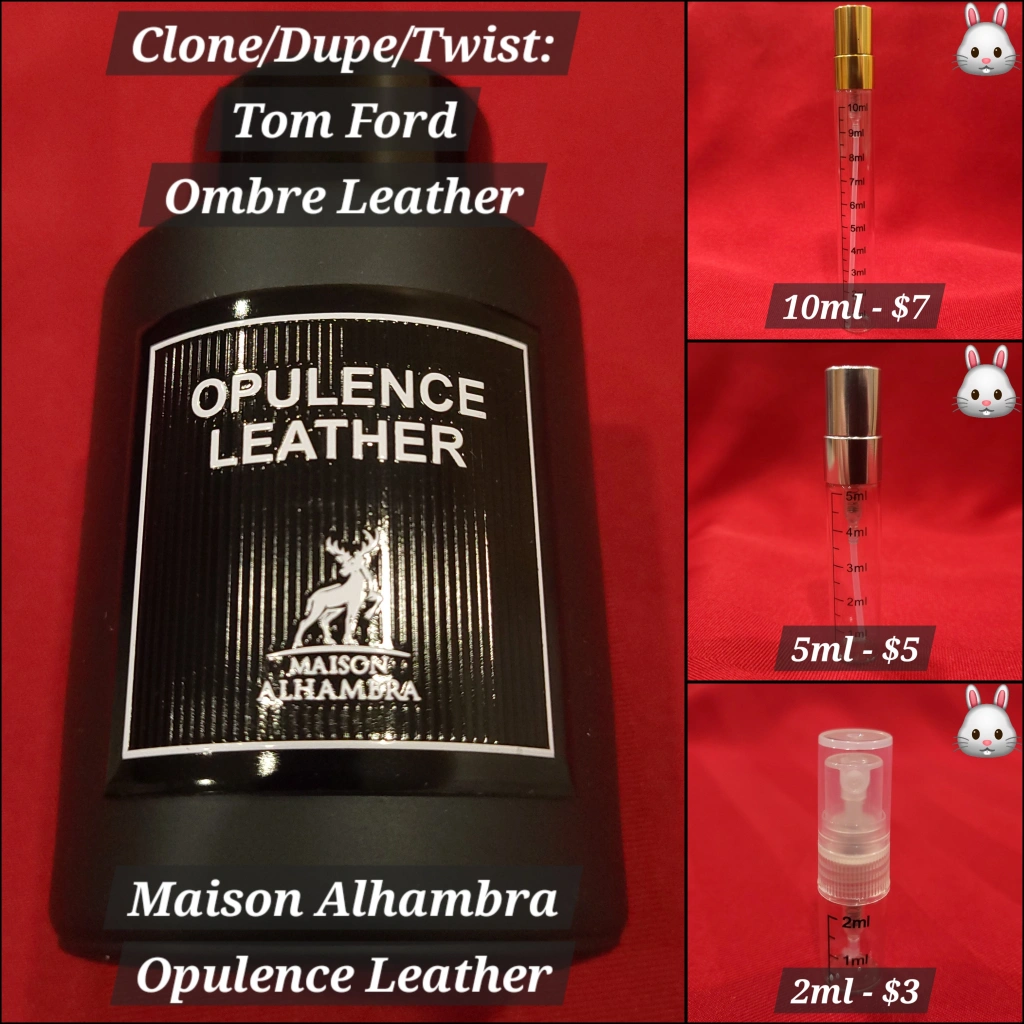 Maison Alhambra Opulence Leather perfume, a Tom Ford Ombre Leather clone. Available in 2ml, 5ml, and 10ml sizes.