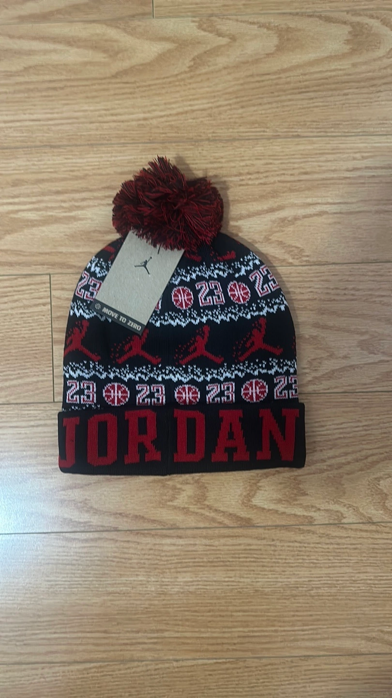 Jordan Brand beanie. Features a pom pom and a festive design. Knit material. New with tags.