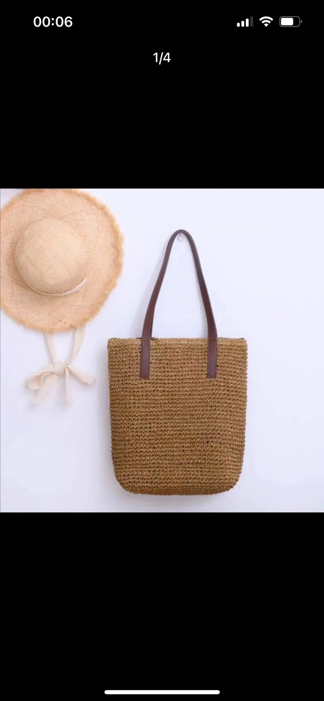 122Brown straw tote bag. Features brown leather handles. Perfect for summer.
