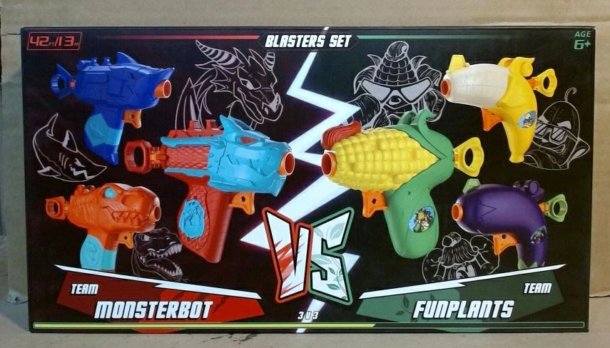 Six-piece blaster set. Includes various colorful designs. Soft foam darts included. Fun for kids!