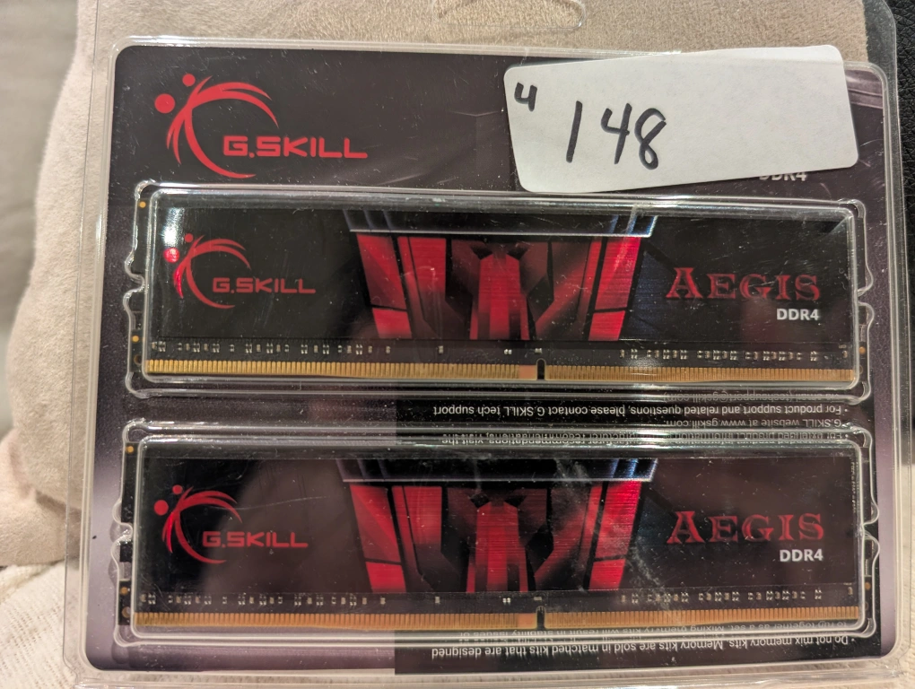 Two sticks of G.Skill Aegis DDR4 RAM. 16GB total, 8GB per stick. 3000MHz speed. New, still in packaging.