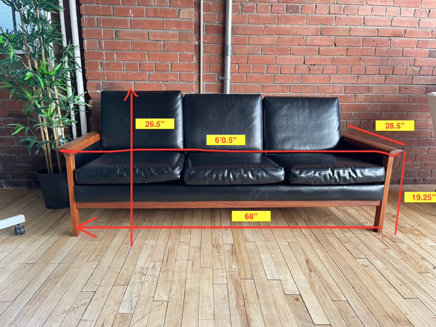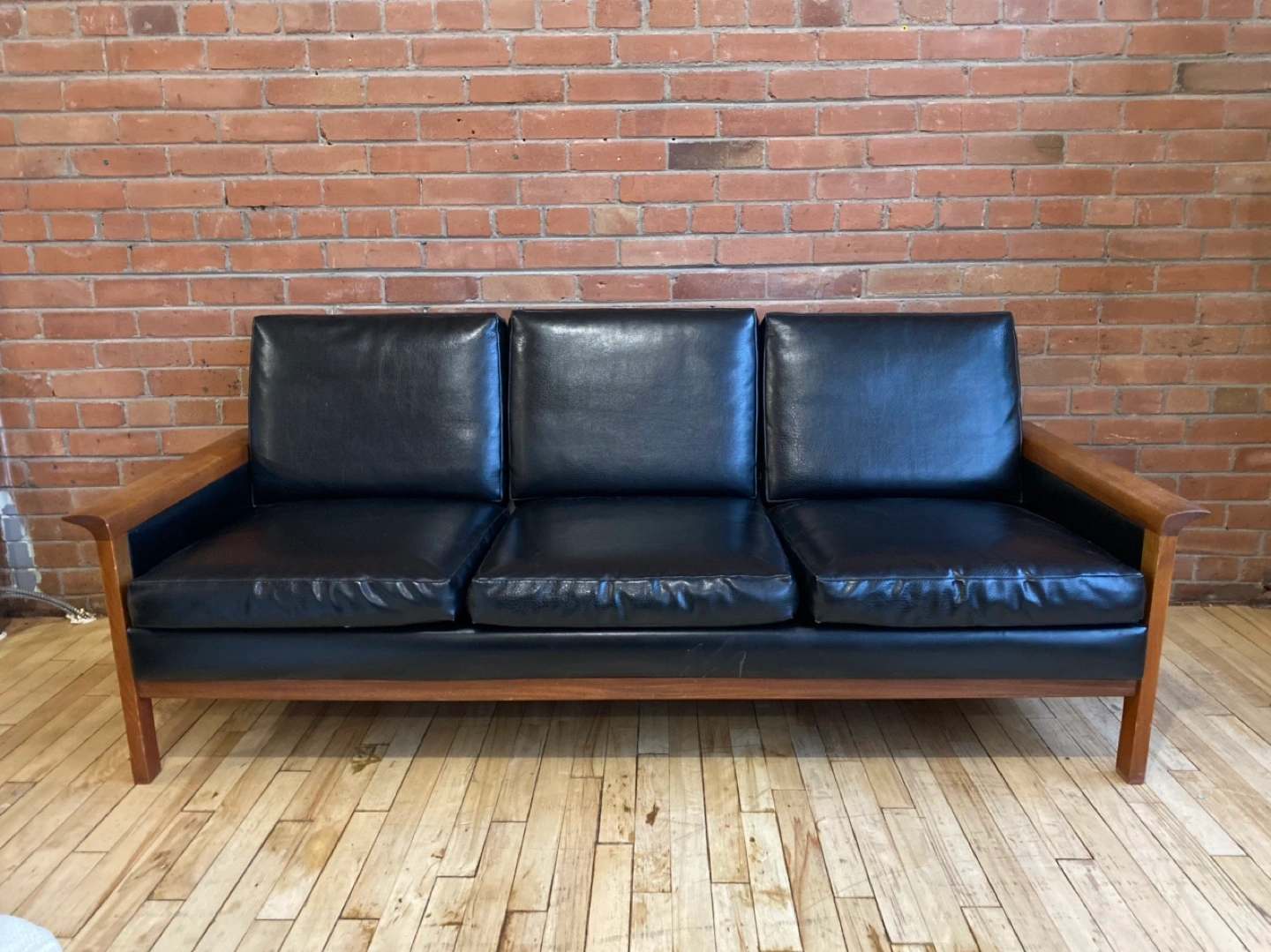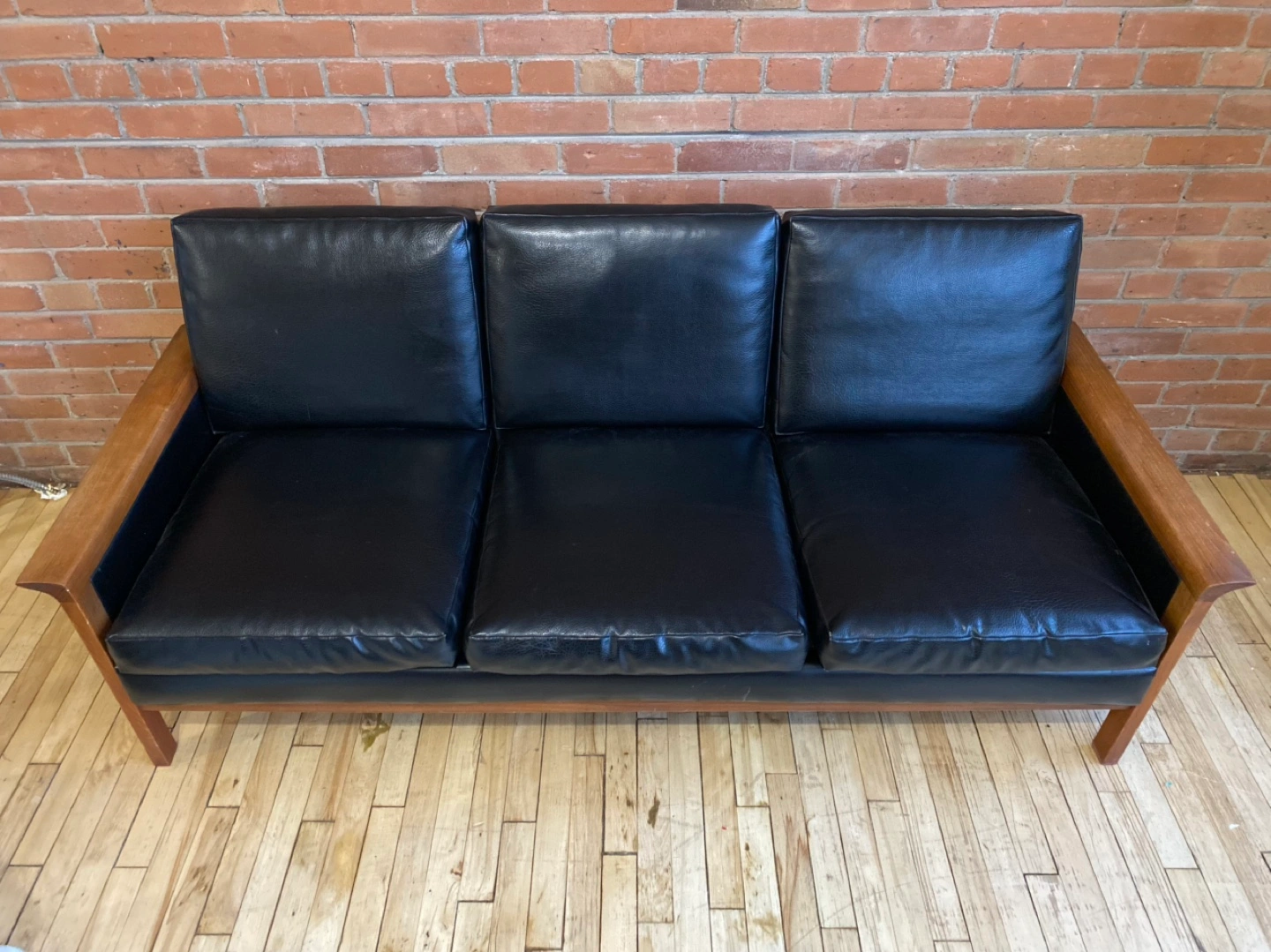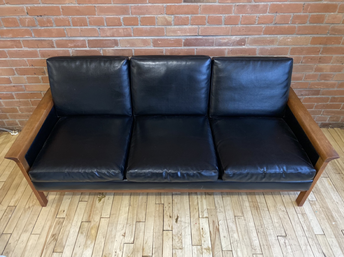 Beautiful mid-century modern 3-seater couch/sofa in black faux leather with removable individual cushions. Features warm oak wood armrests and legs.