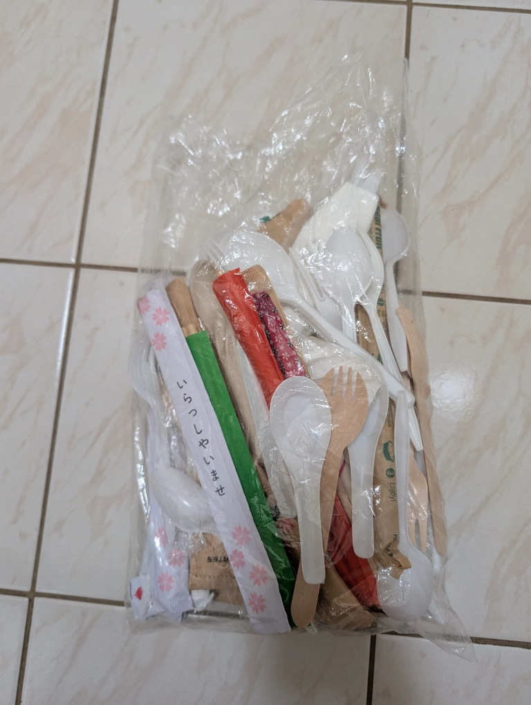 Large bag of assorted disposable cutlery. Includes wooden chopsticks, plastic forks, spoons, and sporks. Great to keep in the car for quick access when you are on the go.