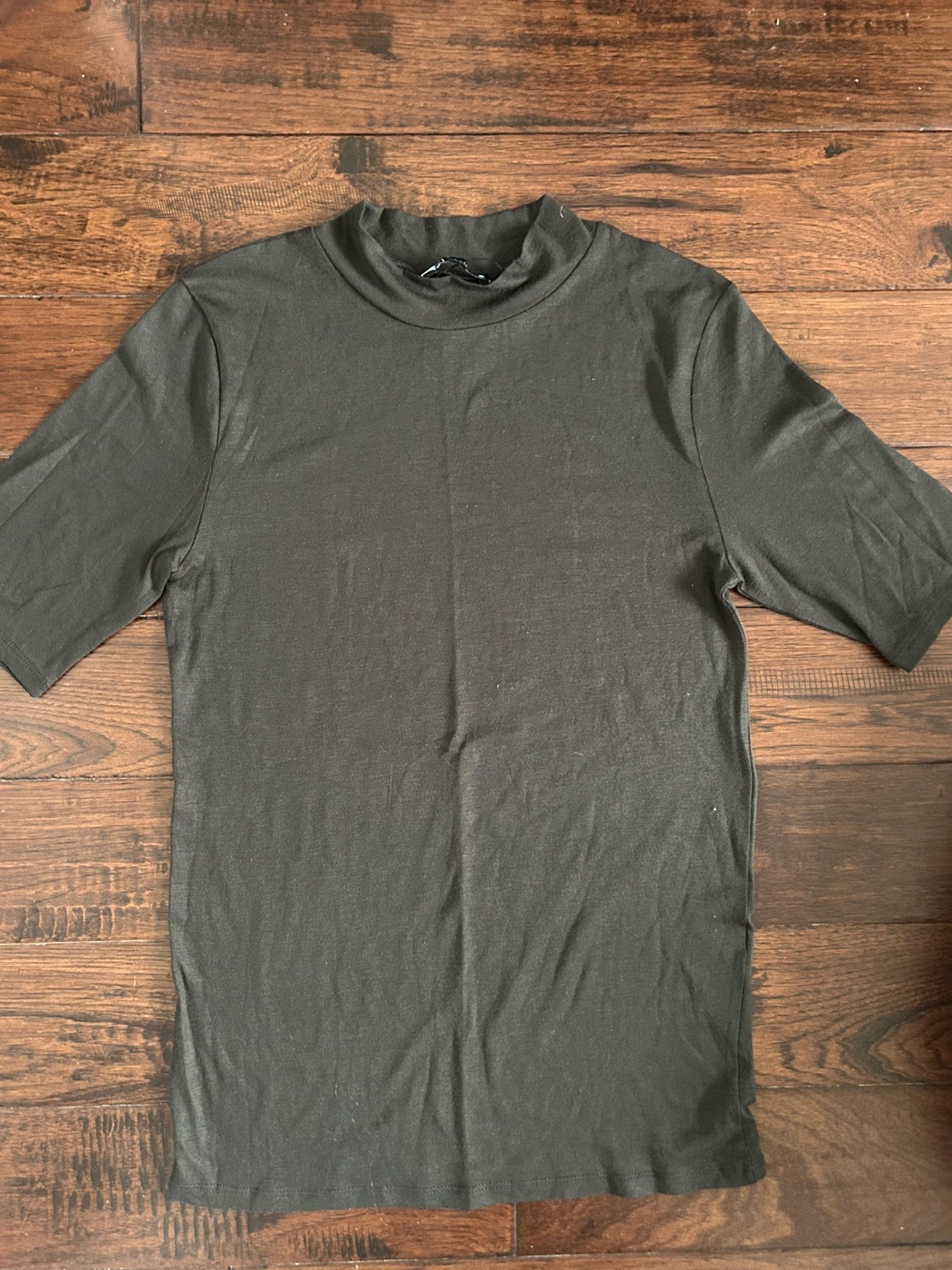 Grey mock neck, short sleeve t-shirt. Size Large. Soft material. Great for layering or wearing alone.