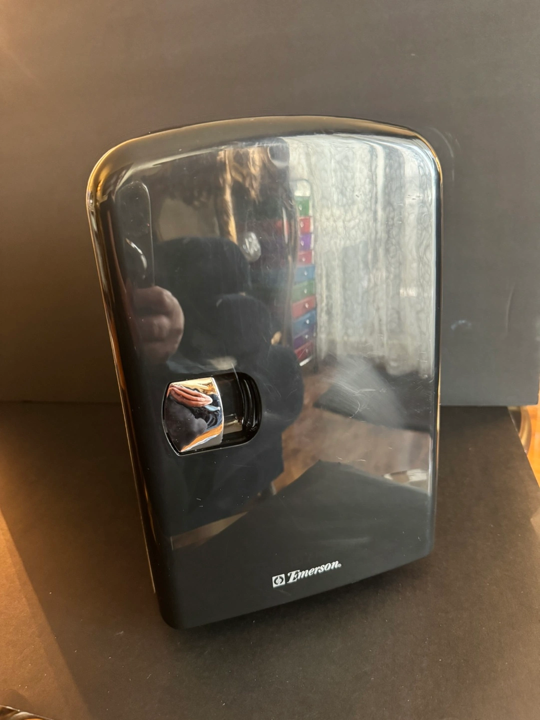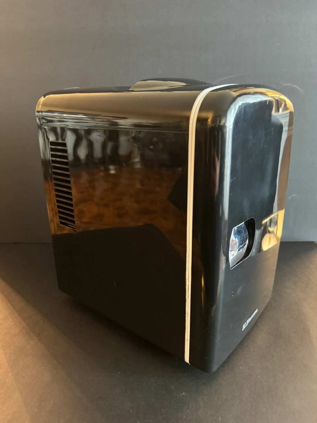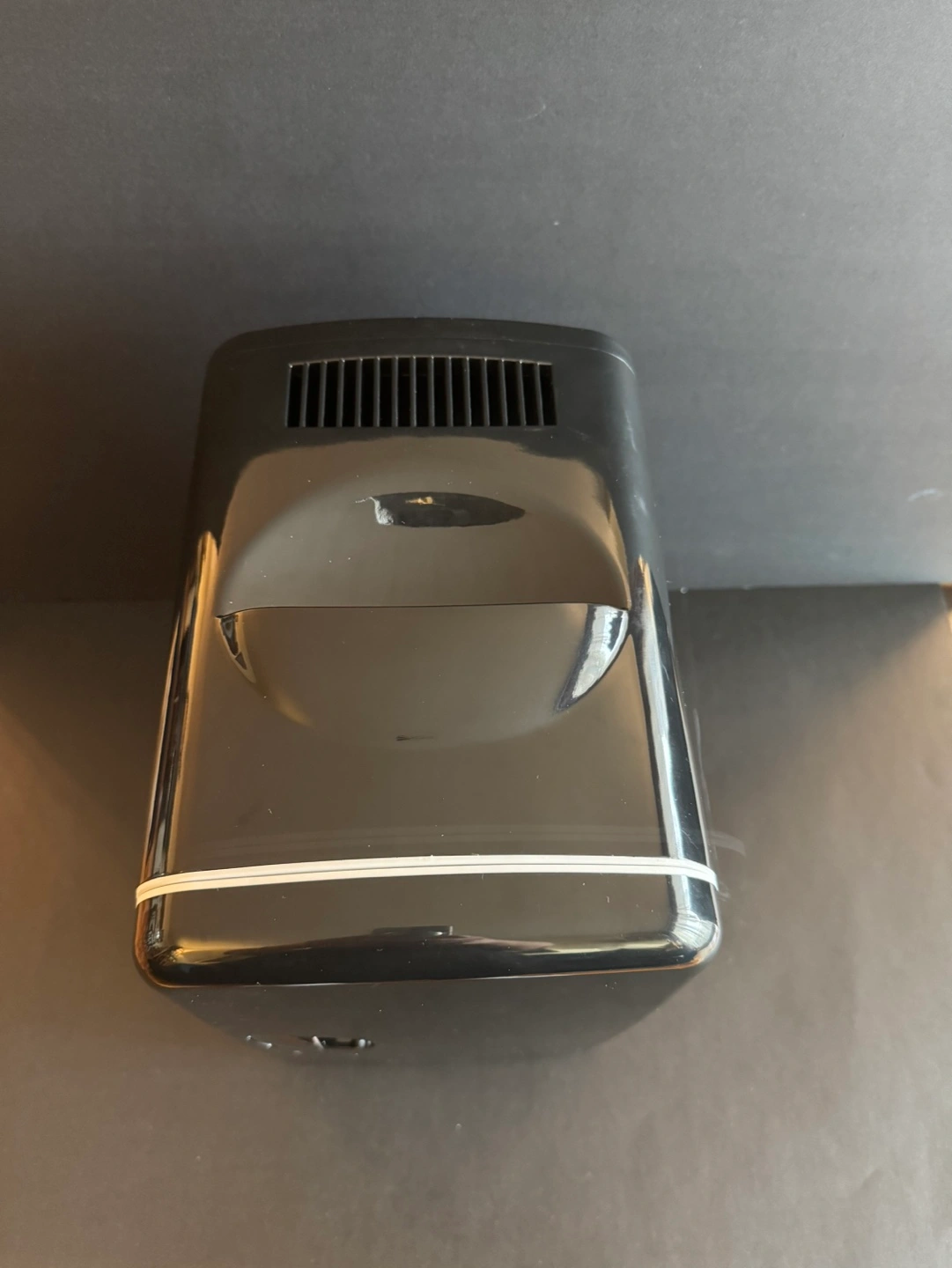 60Black mini fridge. Small, portable design. Ideal for dorm rooms or offices. Has a small handle on top.