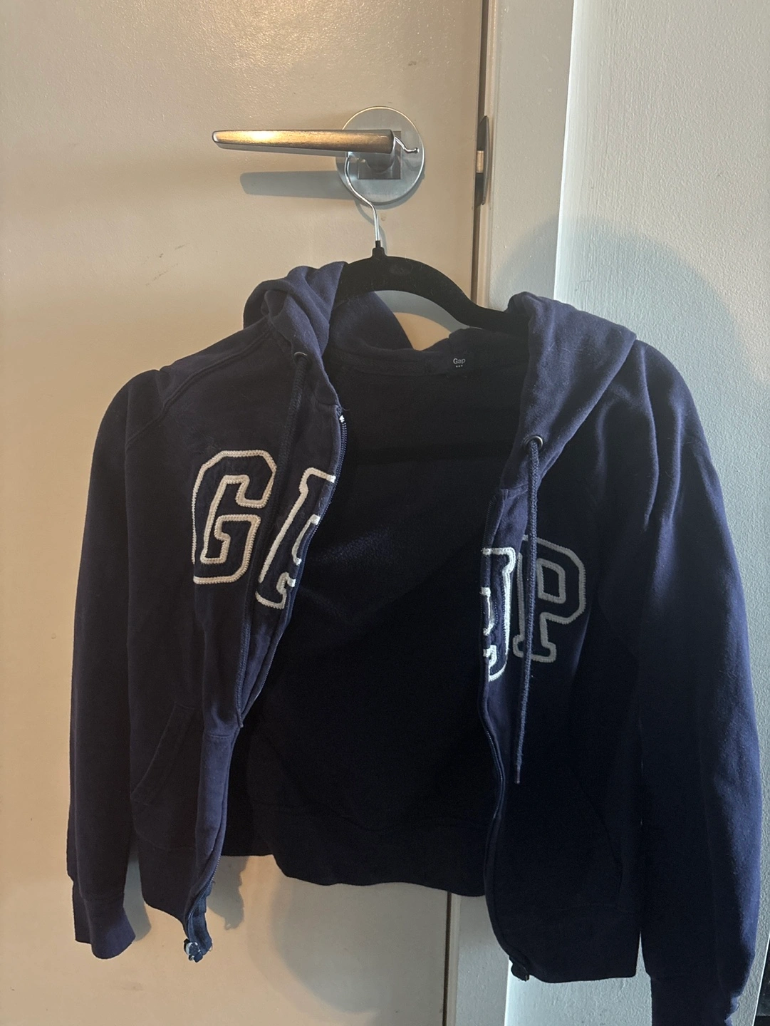 142Women's navy blue zip-up hoodie. Features a large Gap logo across the chest. Long sleeves, hooded.