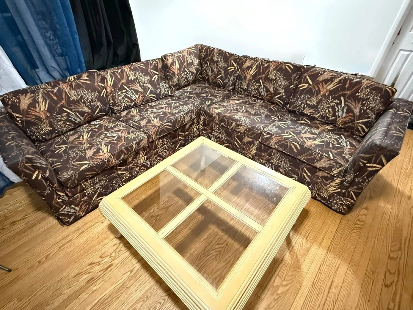 Large sectional sofa, brown fabric with leaf pattern. Includes a glass-top coffee table with a beige frame. Good condition. Price is Negotiable.