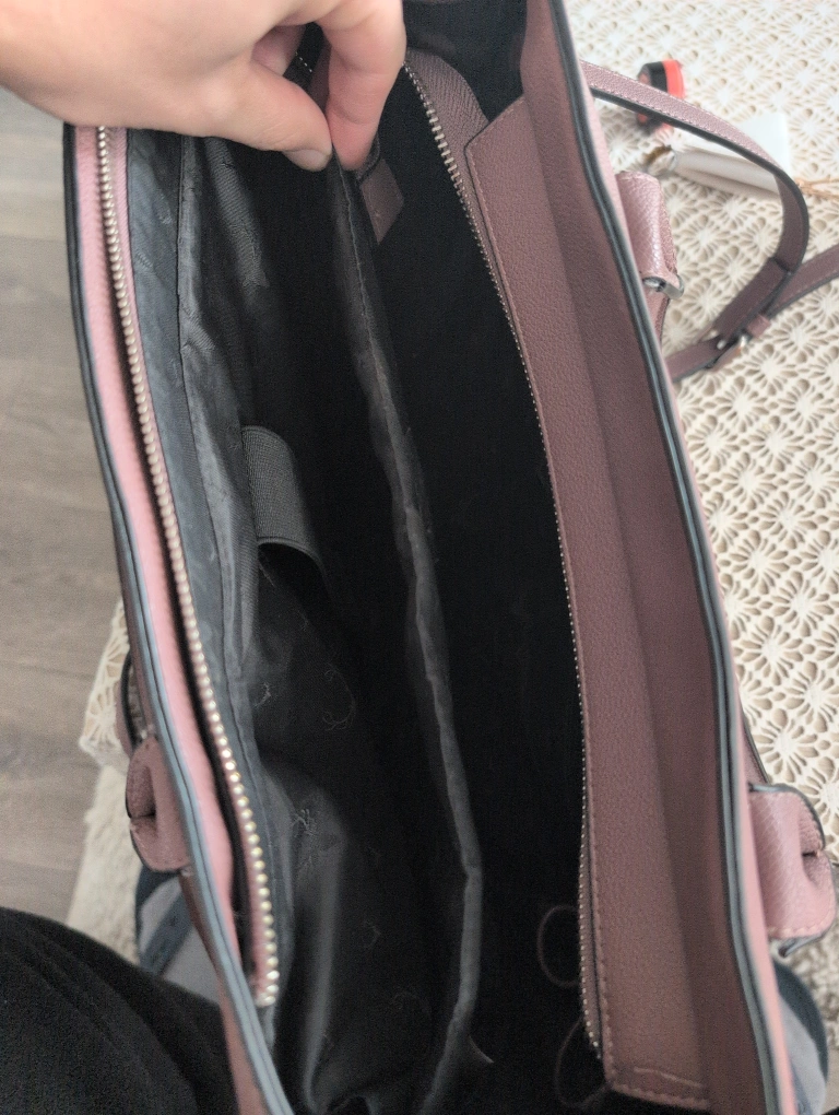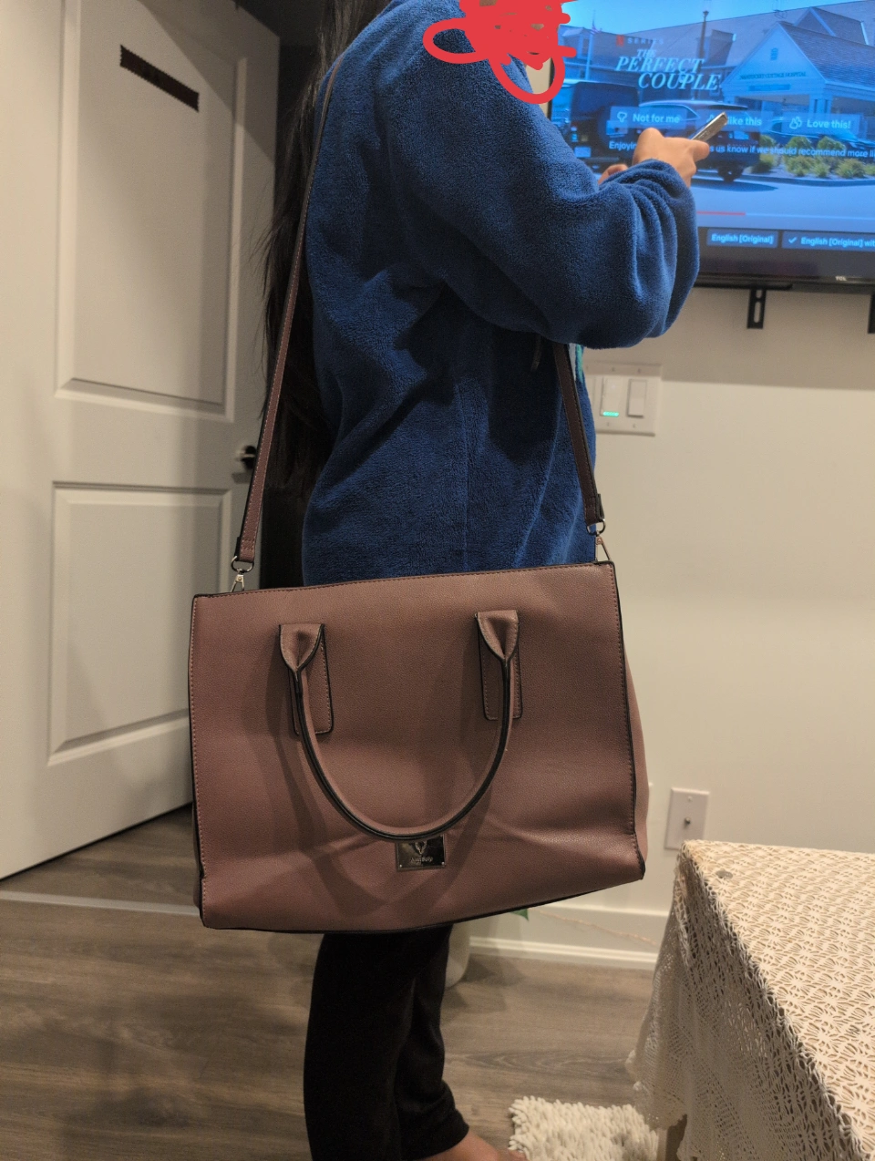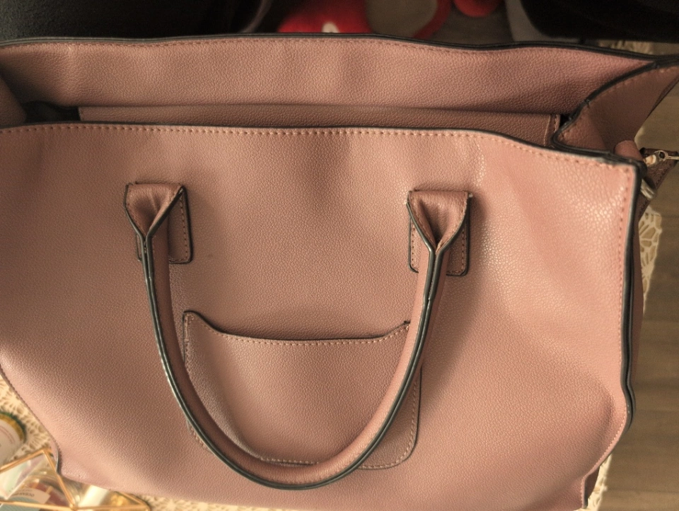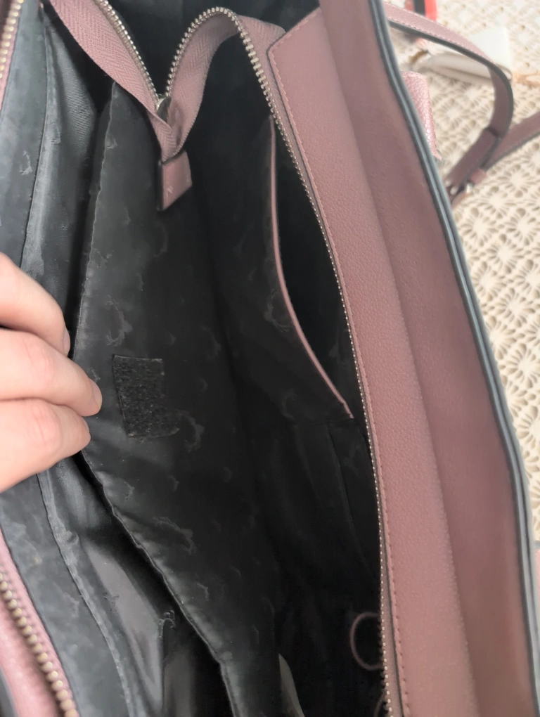 1000+Large mauve satchel handbag. Top handles and removable shoulder strap. Zipper closure. Interior pocket. Some minor wear. Can carry a 15inch laptop as well in the office.