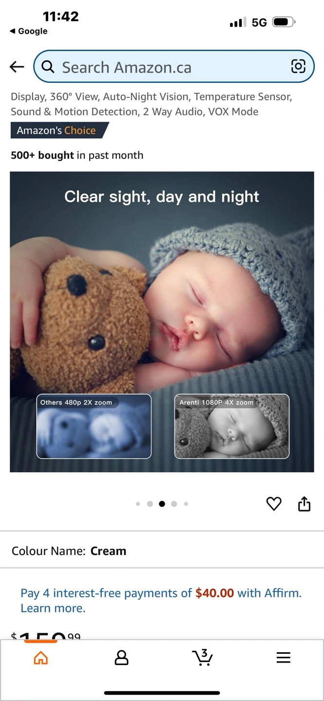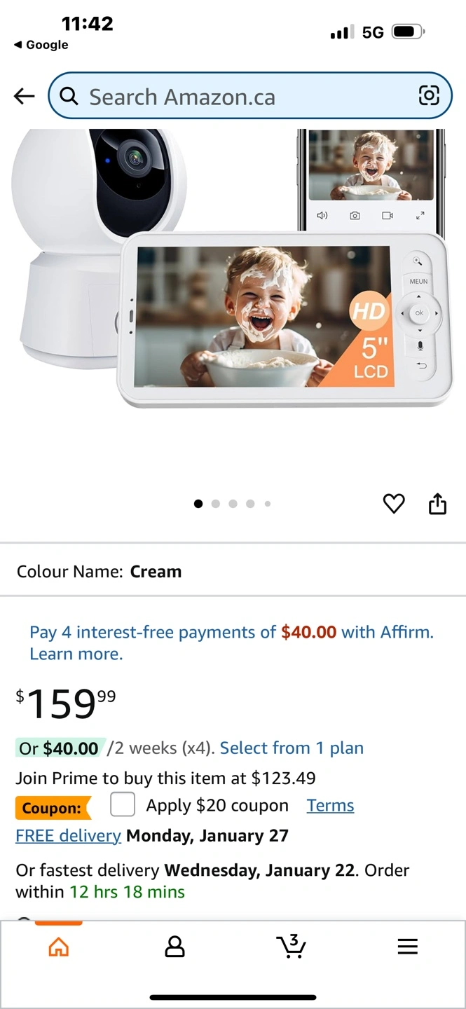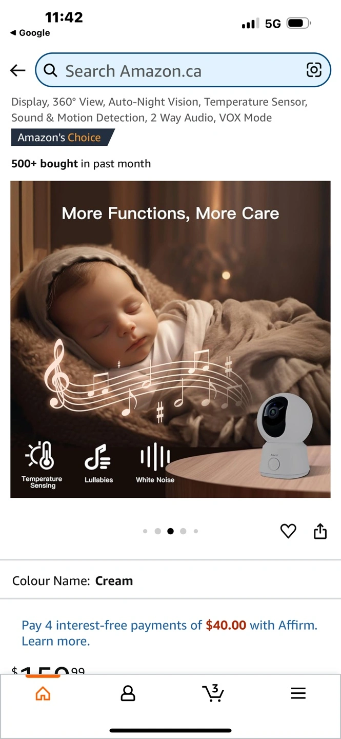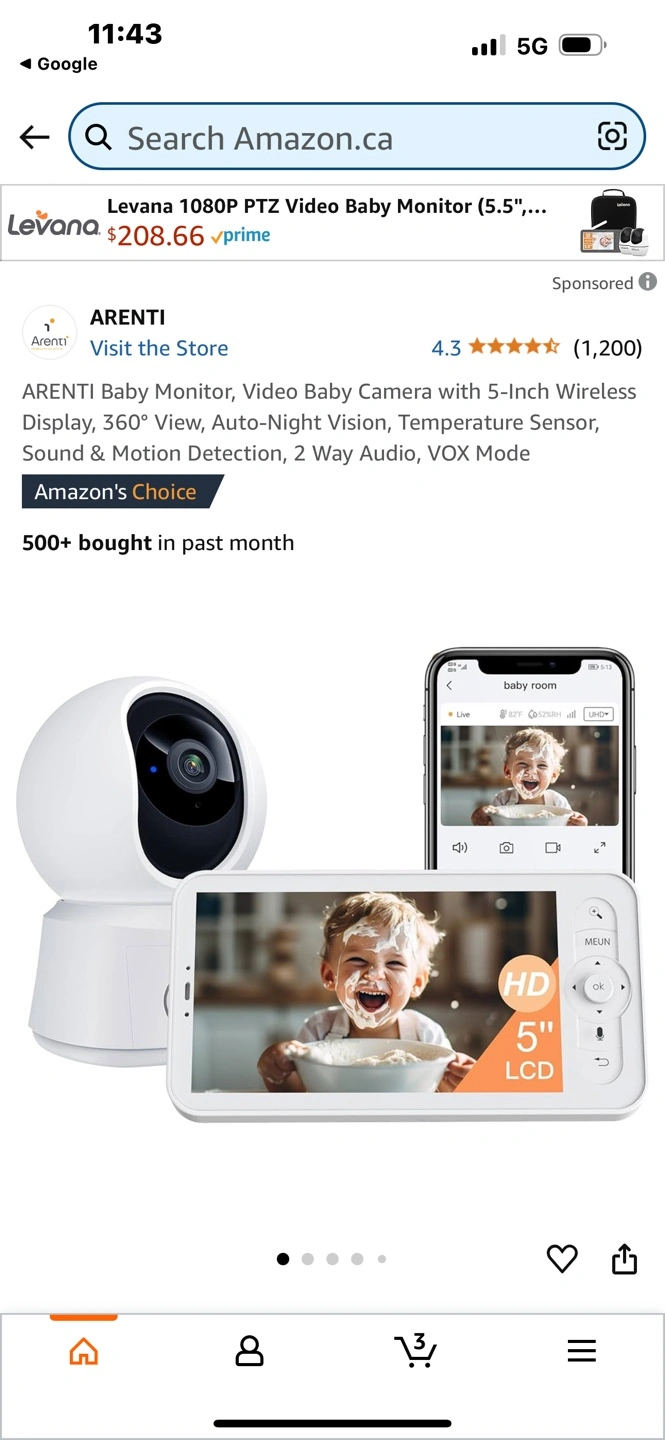 15New, unopened Arenti Alnannay B2 baby monitor kit. Includes 1080p camera and 5" LCD screen. Features 360° view, night vision, temperature sensor, two-way audio, and VOX mode. Cream colour. Cash pick up only