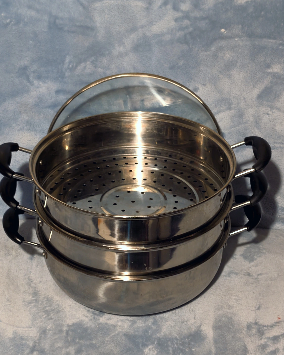 Three-tier steamer. Stainless steel construction. Glass lid with knob. Black handles. Perfect for steaming vegetables, dumplings, and more.