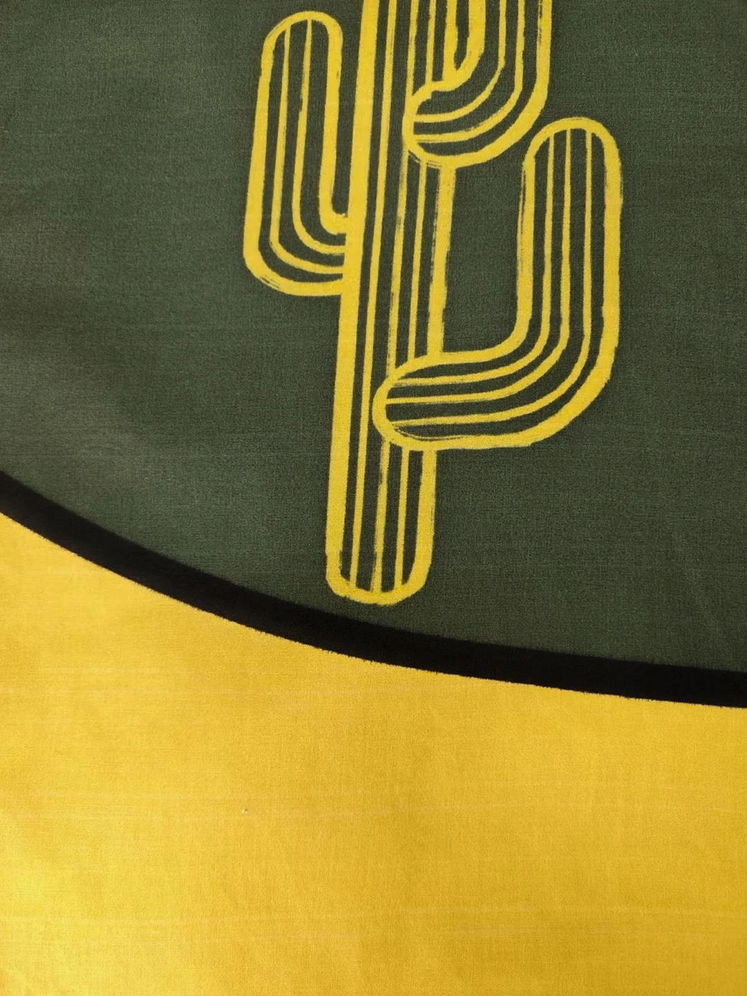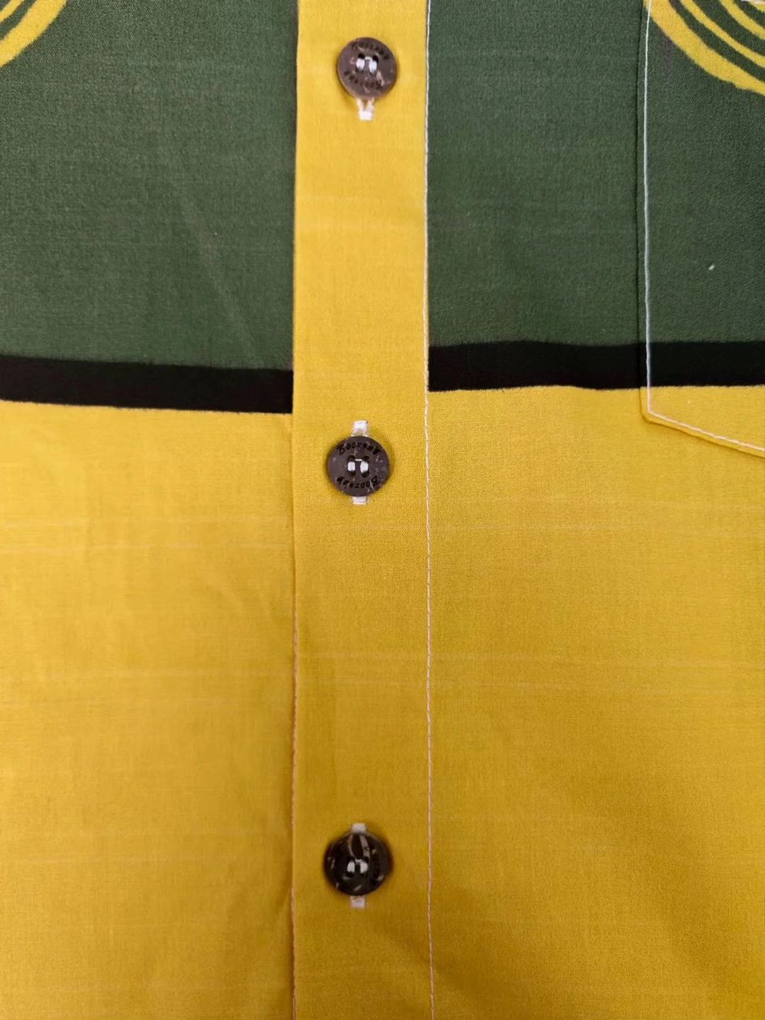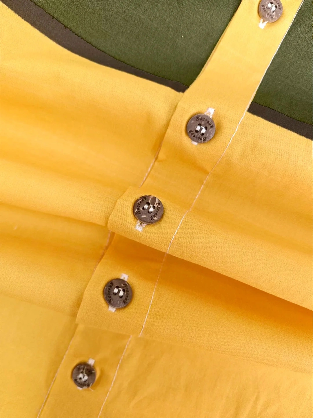 Short-sleeved button-down shirt. Features a yellow and olive green colour scheme. Cactus print on the yoke. Size M