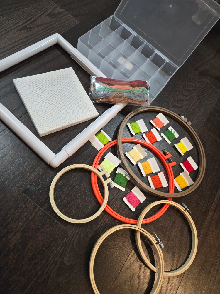 677Cross stitch kit includes a plastic frame, Aida cloth, a storage container, several embroidery hoops of varying sizes, and a large variety of floss. Perfect for beginners!