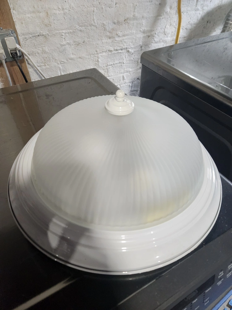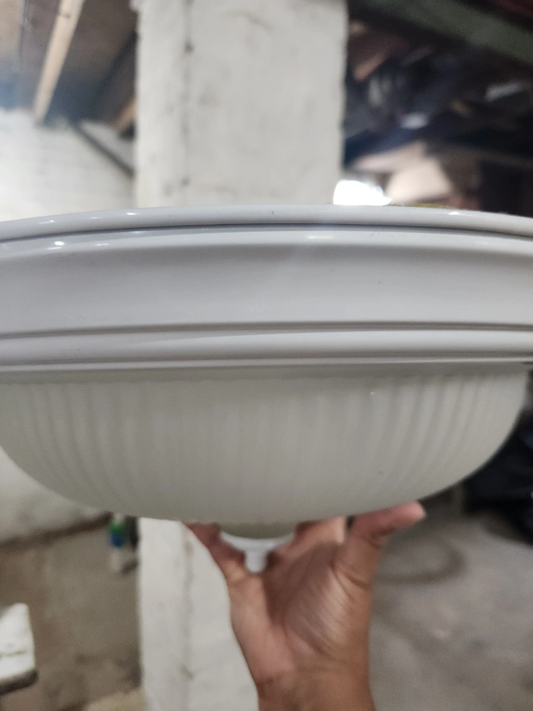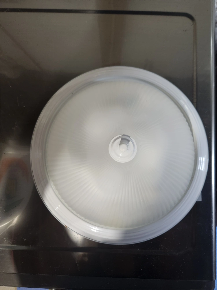 195White ceiling light fixture. Round, ribbed glass shade. Simple design. Used condition. Wiring included. Easy installation.