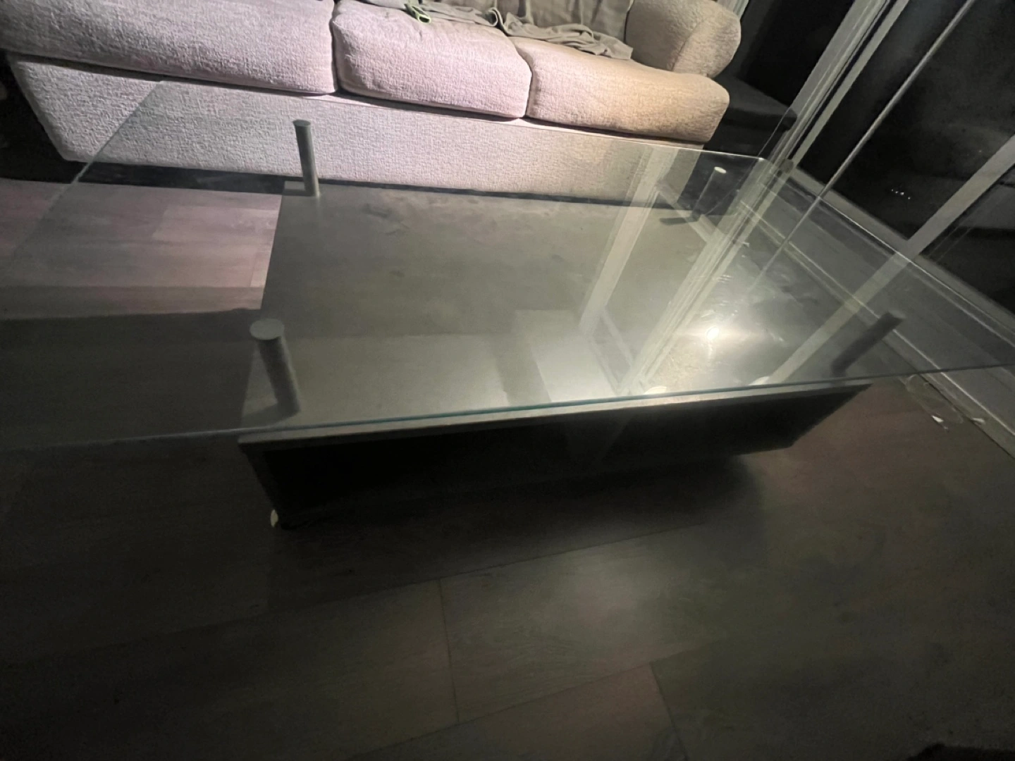 Modern coffee table, glass top, dark grey frame. Features a lower shelf. Wheels for easy mobility. Some surface wear - has scratches on the glass but only visible