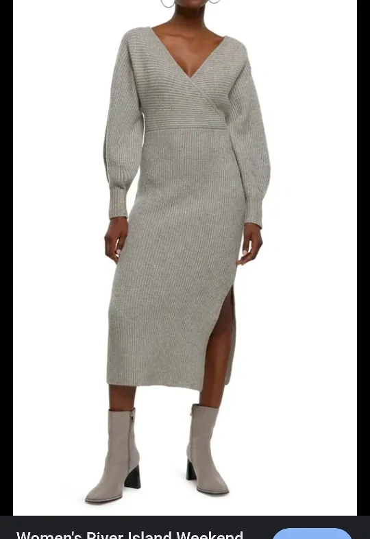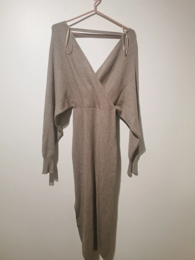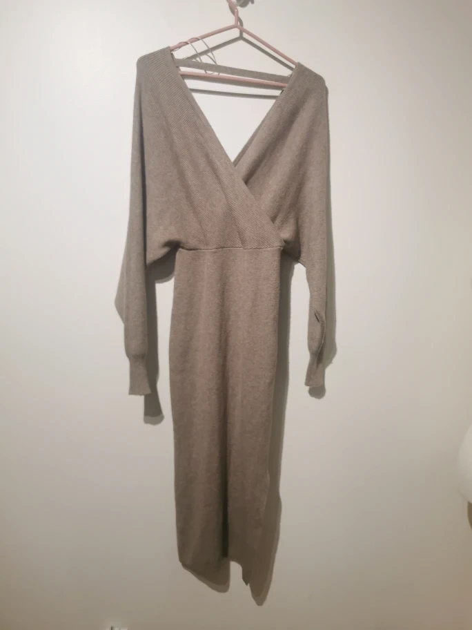 Taupe ribbed knit midi dress. Features a V-neckline, crossover bodice, long sleeves, and side slit. Relaxed fit.