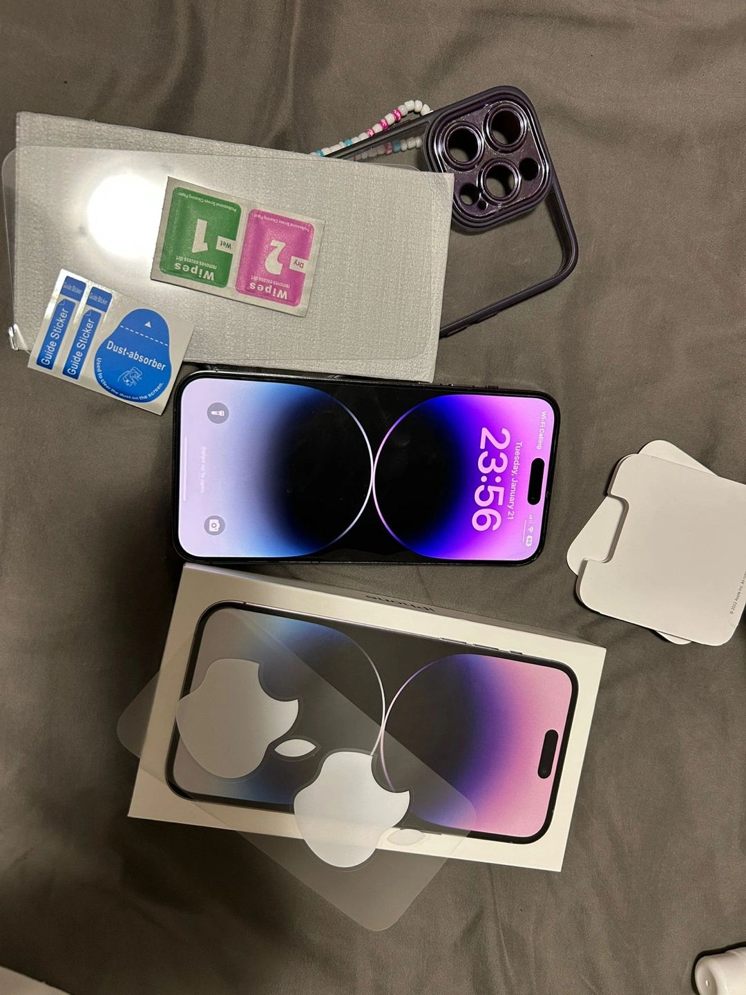 Selling a gently used iPhone 14 Pro Max deep purple Includes original box and accessories. Screen protector and phone case included. Excellent condition.