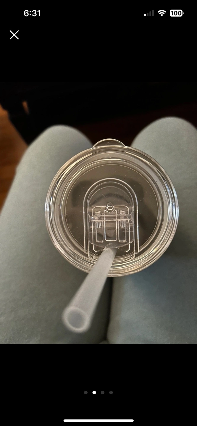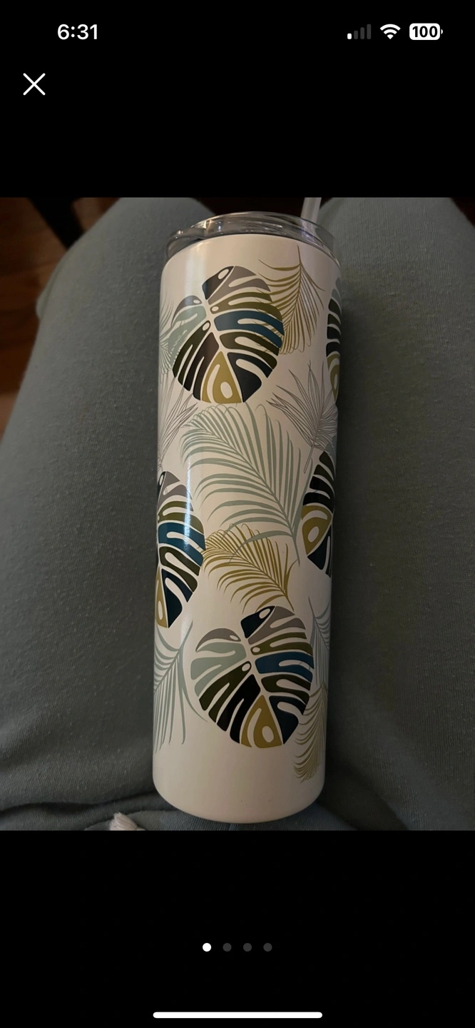 Reusable stainless steel tumbler. Features a tropical leaf design. Clear lid with straw.