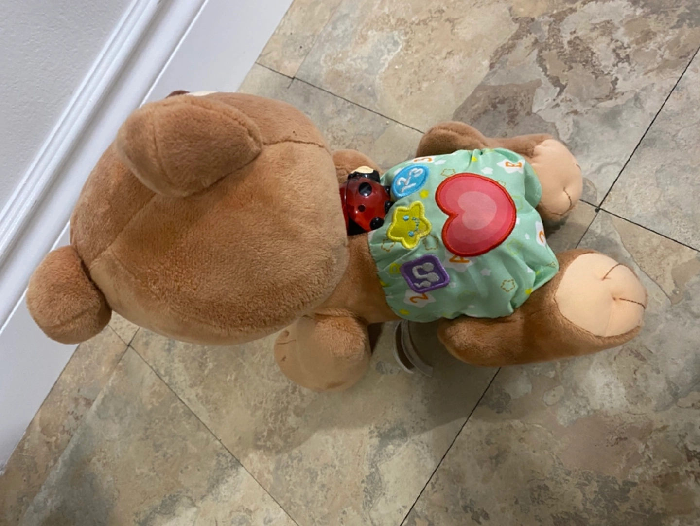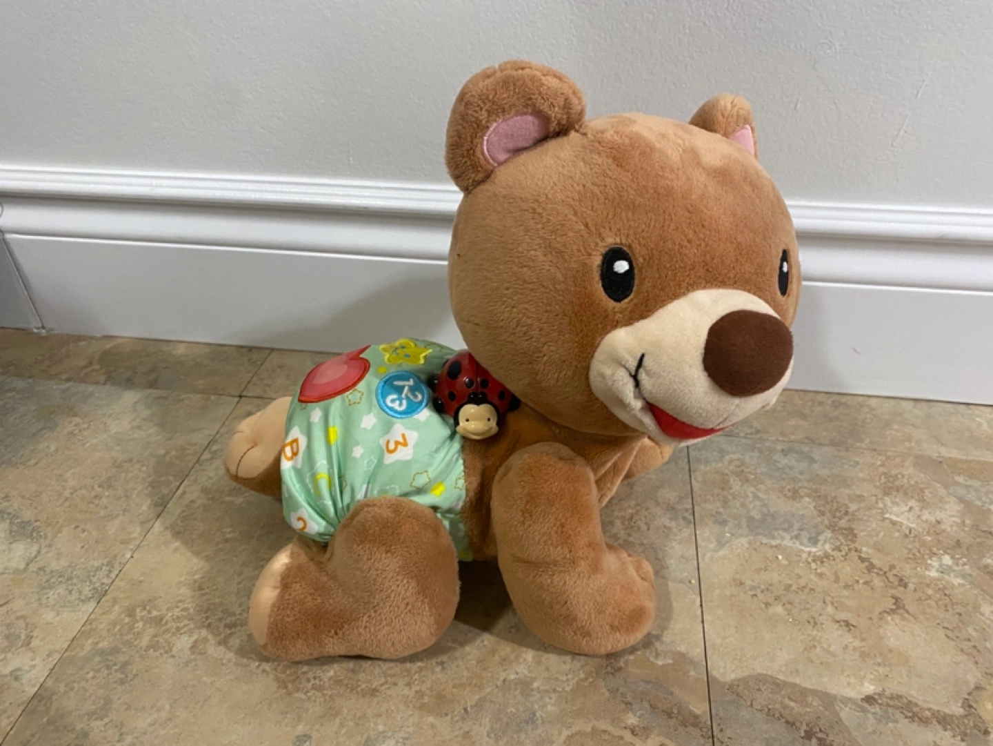 Adorable brown plush bear. Features a ladybug and plays sounds. Great for babies and toddlers. In excellent condition