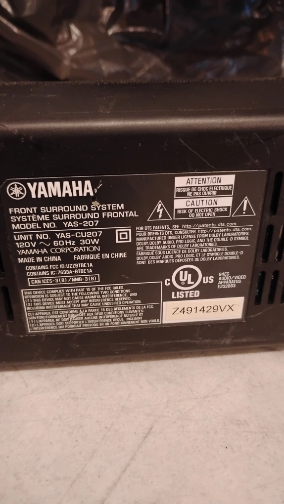 Yamaha YAS-207 Soundbar. Bluetooth, Dolby Audio, DTS, HDMI. Good condition. Includes power cord. comes with the subwoofer as well for some deep bass.